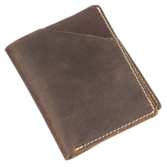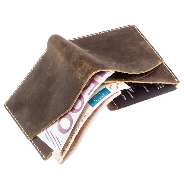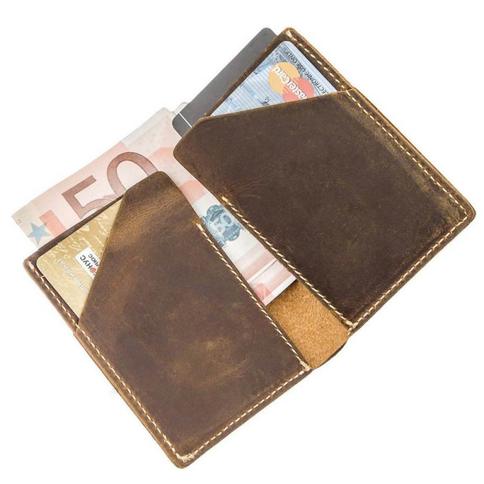 Компактный бумажник с минимальным размером темно-коричневого цвета. Модель обладает минимальным, но самым необходимым функционалом. Бумажник вместится в карман брюк. Изделие подходит как мужчинам, так и женщинам. Винтажная кожа, из которой выполнен бумажник пользуется особенной популярностью среди клиентов. А ее основной изюминкой является то, что со временем на такой коже выступают своеобразные царапины и потертости, которые придают ей шарм. Такой бумажник будет чудесным подарком для ваших близких.