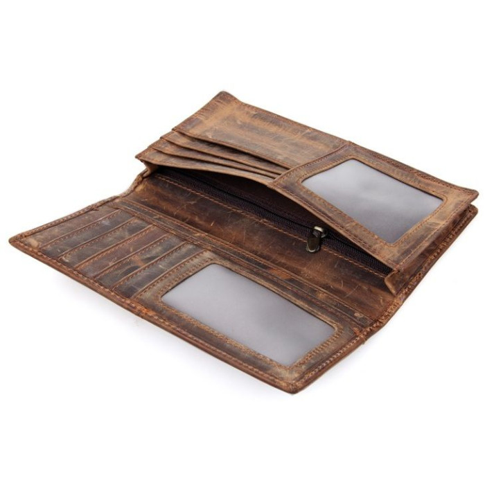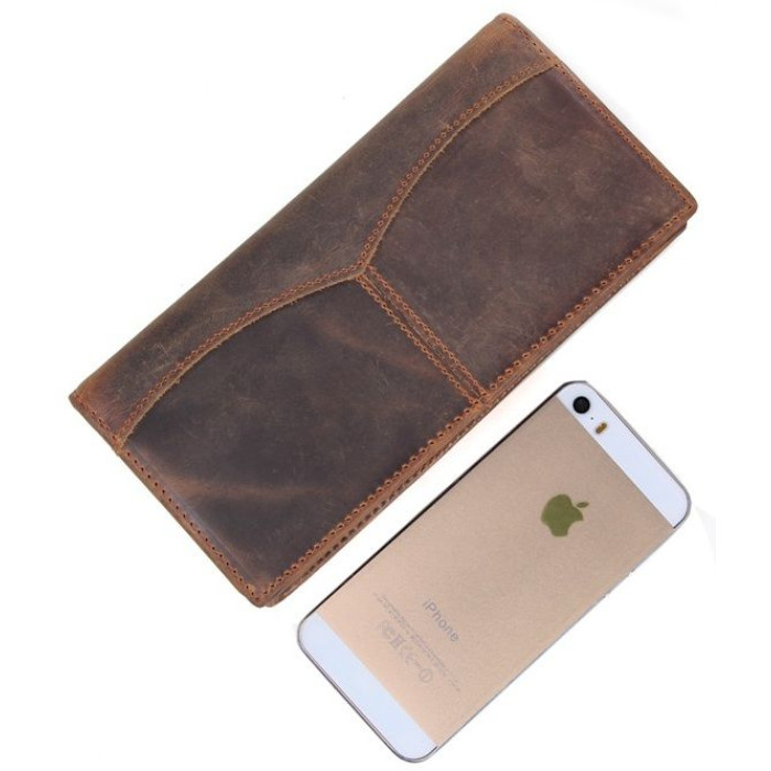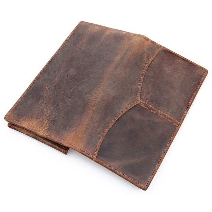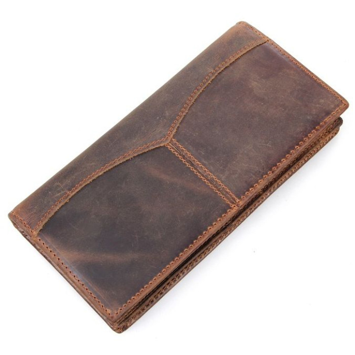 Современный мужской купюрник из натуральной высококачественной винтажной кожи. Кошелек надежно прошит сверхпрочной нитью коричневого цвета. Швы ровные, аккуратные. Аксессуар упакован в текстильный пылезащитный чехол.