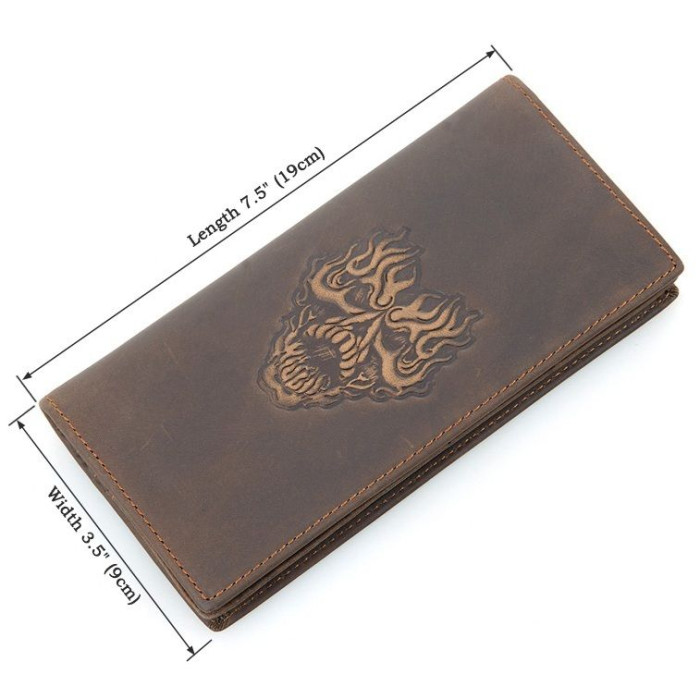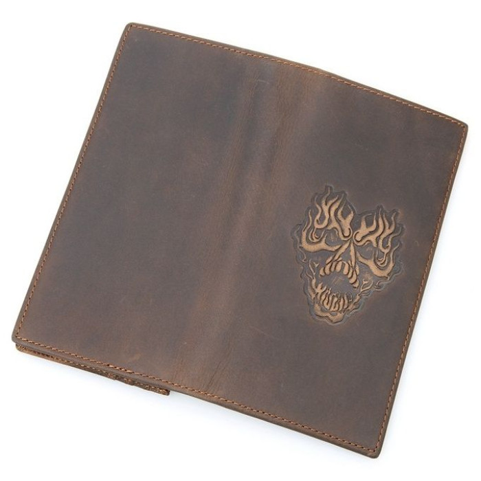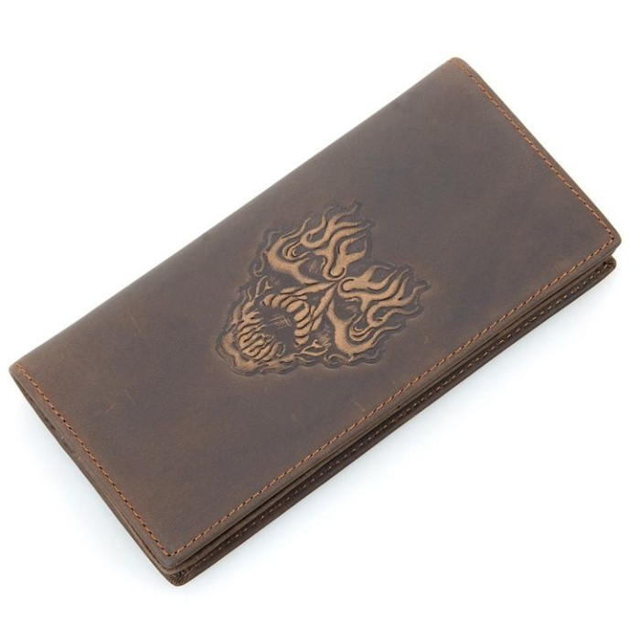 Оригинальный мужской вертикальный бумажник с дизайнерским рисунком на лицевой стороне. Кошелек изготовлен из натуральной высококачественной винтажной кожи, и аккуратно прошит прочной нитью. Данную модель удобно держать в руке. Кошелек не поместиться в кармане джинсов, но даже самые длинные купюры помещаются в нем в развернутом состоянии. Аксессуар упакован в текстильный пылезащитный мешочек белого цвета.