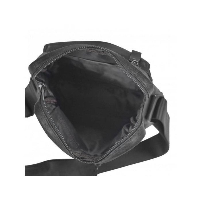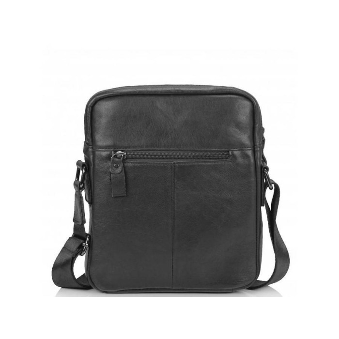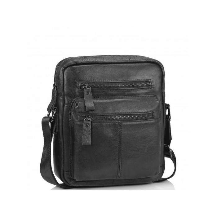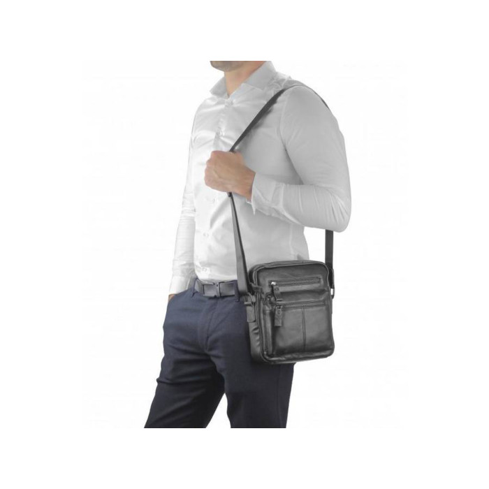 Мужская сумка через плечо черного цвета с натуральной кожи гладкой структуры. Текстильный ремень регулируется по длине, качественная фурнитура темно-серебряного цвета, пуллера кожаные. Внутри сумки - одно основное отделение и карман на замке. С лицевой стороны сумки - накладной карман на замке и маленький карман на замке над накладным карманом, с тыльной - один карман на замке.
