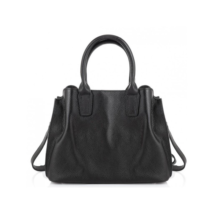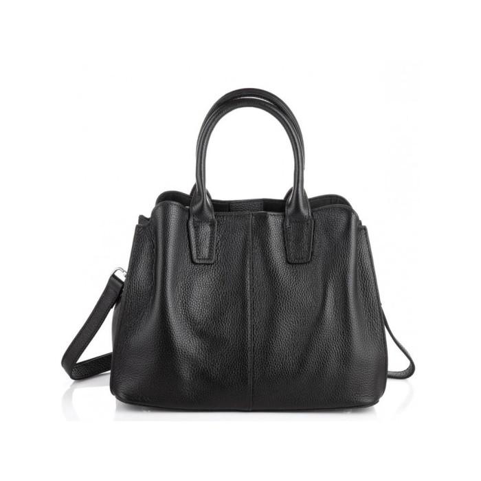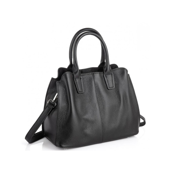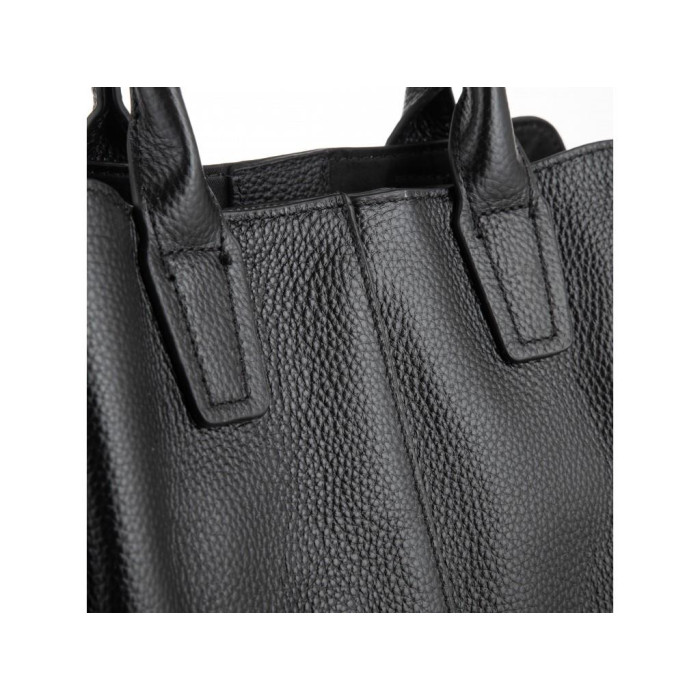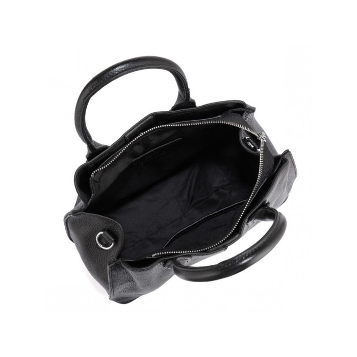Черная кожаная женская сумка с одним отделением. Один открытый внутренний караман, второй внутренний карман на молнии. Два внешних кармана на магнитах.