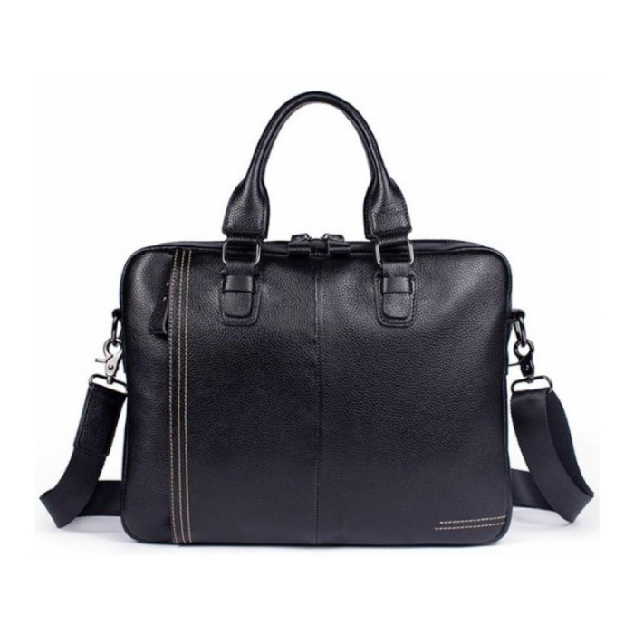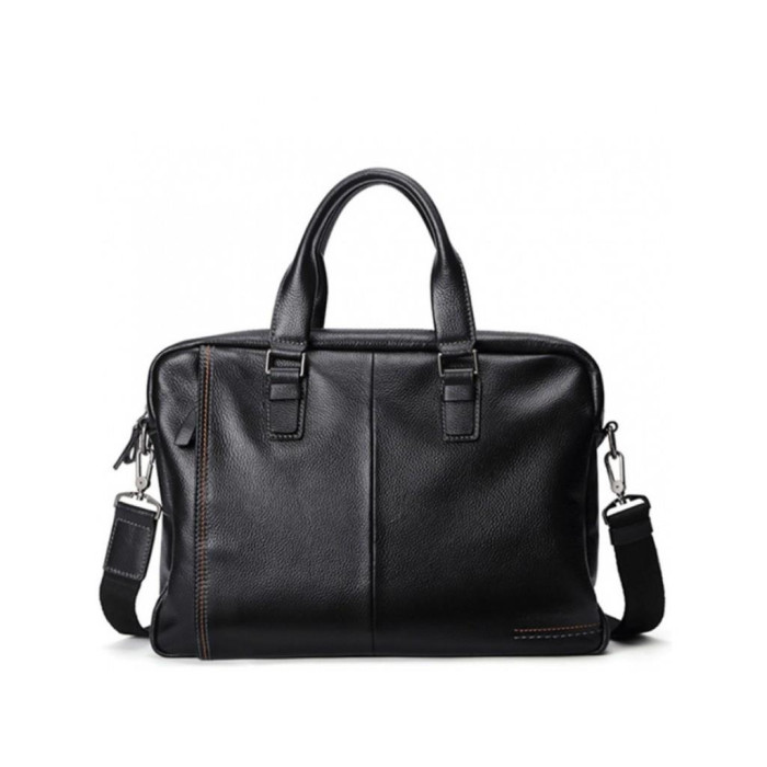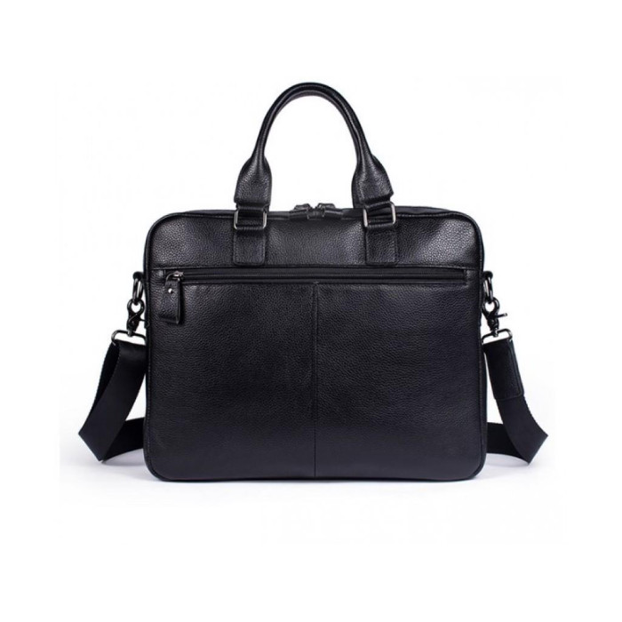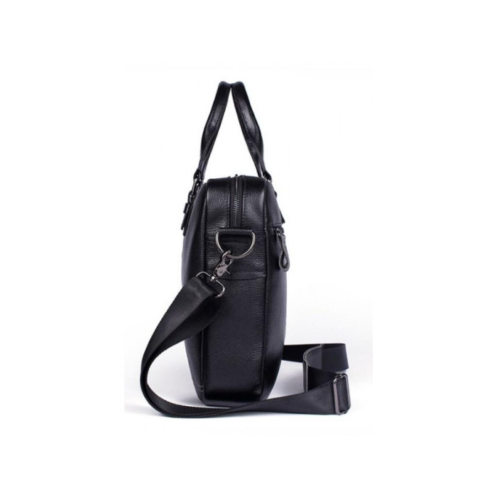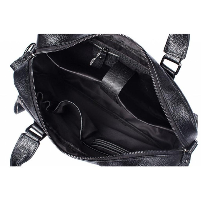 Черная сумка для ноутбука из натуральной кожи. Имеет привлекательный и стильный дизайн. Для носки есть плечевой ремень и кожаные ручки. В мужской сумке есть одно основное отделение, с лицевой стороны вертикальный карман на молнии, с тыльной стороны карман на молнии горизонтального типа. Внутри сумки имеется отделение для ноутбука на липучке, карманы открытого типа для мелочей и маленький карман на молнии.