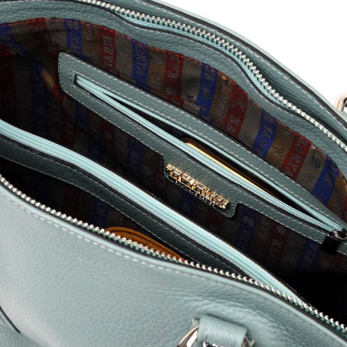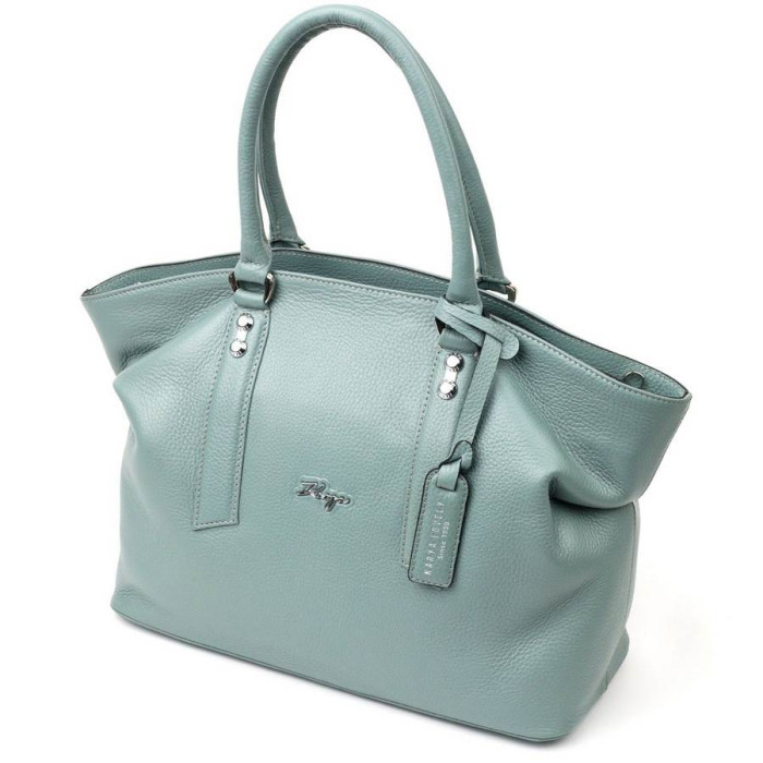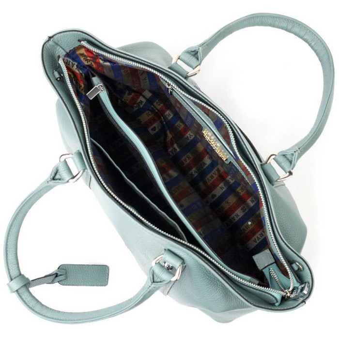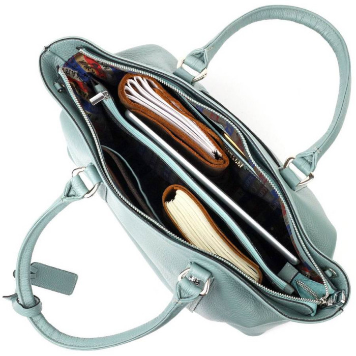 Отличная женская сумка в деловом стиле из натуральной кожи, в стильном дизайне и необычном бирюзовом цвете. Фурнитура серебряного цвета. Сумку удобно носить в руке, на плече. Сумка упакована текстильный чехол. Сумка из натуральной кожи всегда будет отличным подарком любой женщине.