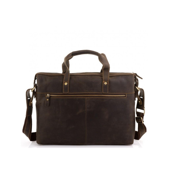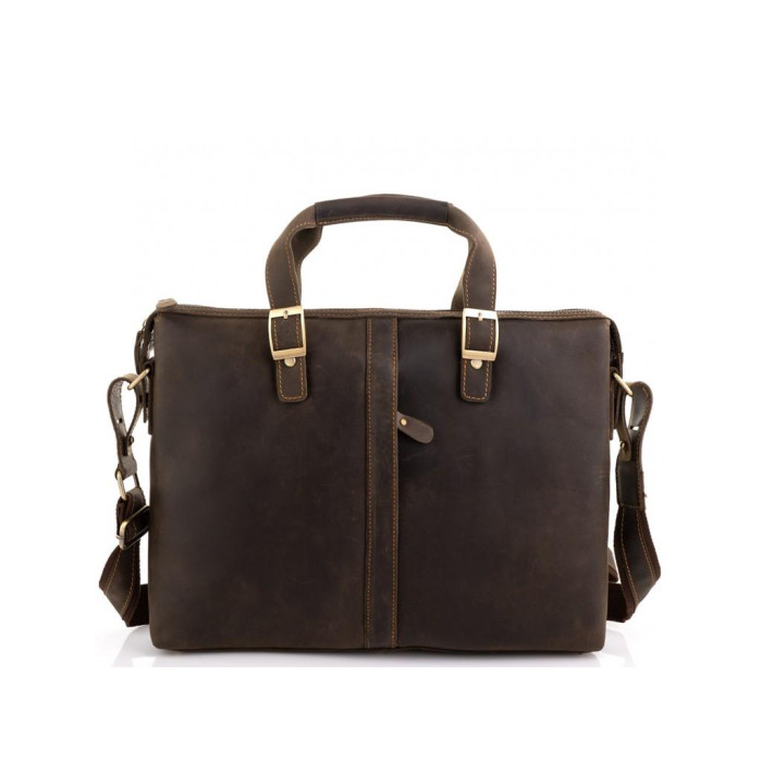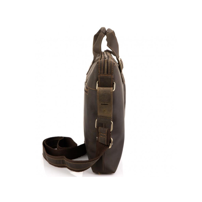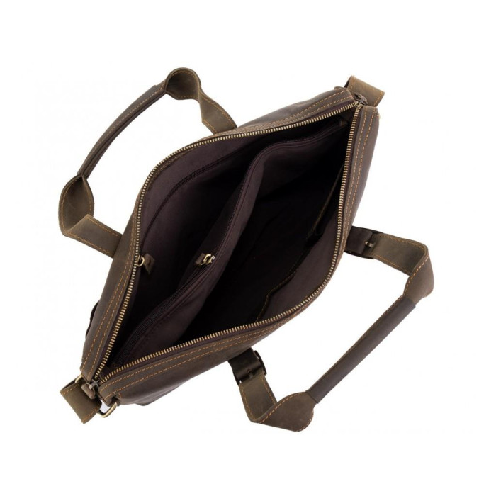 Сумка для ноутбука коричневого цвета сделана из натуральной лошадиной кожи. Для носки предусмотрены кожаные ручки и плечевой ремень. Сумка имеет одно основное отделение, с лицевой стороны есть карман на молнии вертикального типа, с тыльной стороны также есть карман на молнии. Одно основное отделение разделено внутри карманом перегородкой на молнии, также есть карманы открытого типа и карман на молнии для мелочей.
