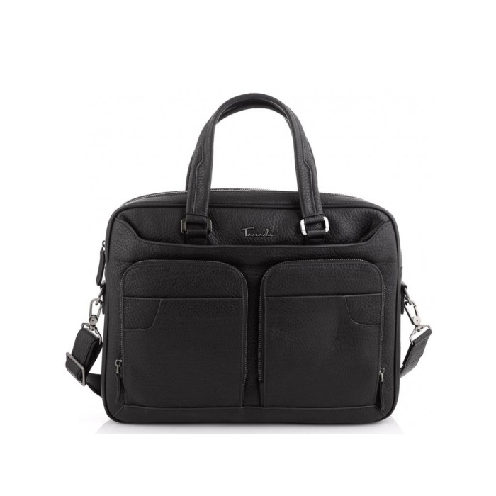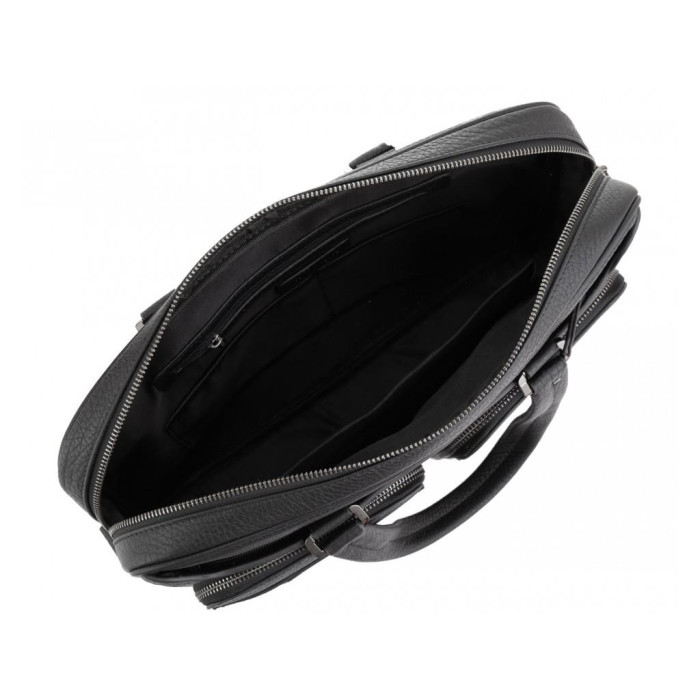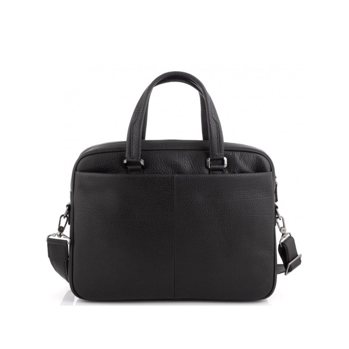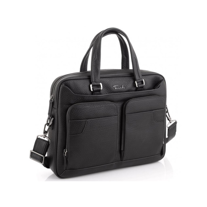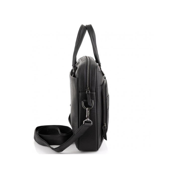 Удобная мужская сумка выполнена из натуральной кожи черного цвета с зернистой поверхностью. Сумка для ноутбука имеет кожаные ручки для ношения и наплечную шлейку из кожи уплотнённую текстильной подкладкой. В основном отделении достаточно места для документов, бумаг и ноутбука с диагональю до 14 дюймов. Мужская сумка имеет одно основное отделение на молнии. С лицевой стороны отдел горизонтального формата на молнии и два накладных кармана также на молнии, с тыльной стороны отдел горизонтального формата на молнии. Внутри сумки 3 кармана открытого типа.