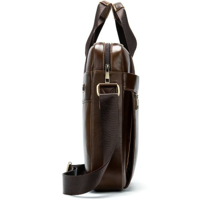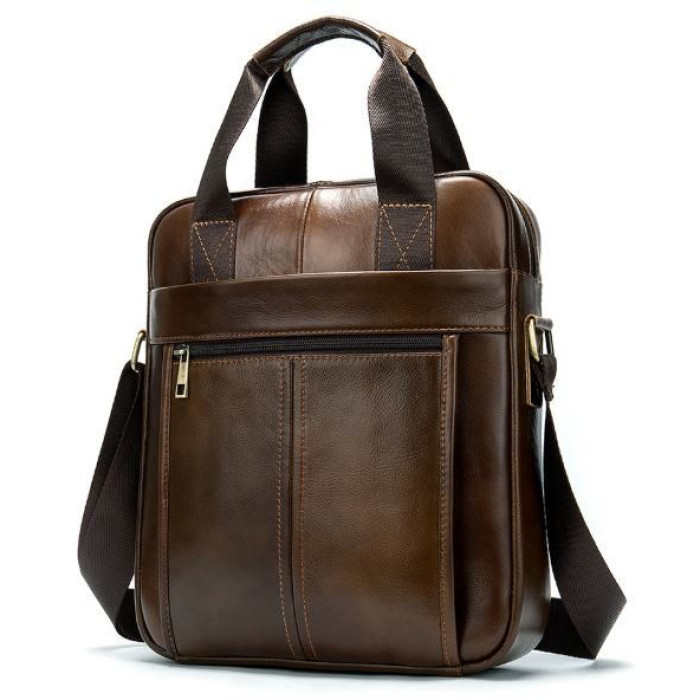 Солидная мужская сумка из натуральной кожи в коричневом цвете. Аксессуар можно носить как в руках с помощью ручек так и на плече есть съемный текстильный ремешок. Модель дополнена металлической фурнитурой. По краям аксессуар прошит рыжей нитью. Вы должны понимать, что немного переплатив за кожану сумку вы выиграете в том, что она прослужит вам намного дольше чем текстильные или из заменителя. Аксессуар удобно держать в руке. Сумка не тяжелая и имеет огромный функционал. В ней вам будет удобно носить документы или планшет или книгу. С такой сумкой будет удобно ездить на встречи или в командировки. Она подчеркнет ваш статус и чувство стиля. Сумка будет желанным подарком для любого мужчины. Аксессуар упакован в тканевой мешок, что защищает его от пыли и влаги во время того как вы его не используете.