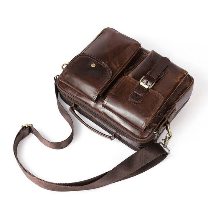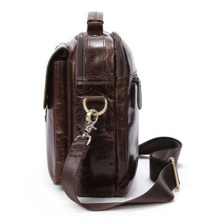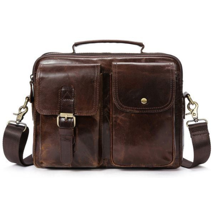 Деловая сумка через плечо среднего размера. Сумка имеет коричневую текстильную подкладку внутри. В аксессуаре удобно носить планшет и ежедневник для встреч. Прекрасный вариант на работу на каждый день. Сумка выполнена из гладкой кожи и прослужит вам достаточно долго. Особенность кожаных сумок в том, что они не требуют к себе какого-то щепетильного ухода. Не пропускает воду и не выцветает на солнце. Вы останетесь довольны таким выбором. Аксессуар упакован в тканевый мешок для удобного хранения.