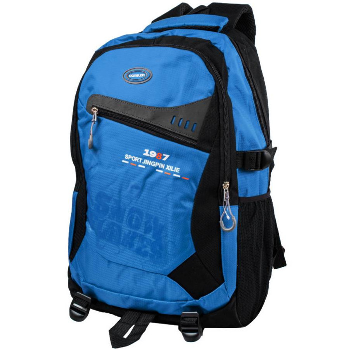 Внешние размеры рюкзака: 33*49*20 см. Объем без учета карманов: 32 л. Вес: 630 г. Количество основных отделений: 2. Внутри есть накладной карман. Материал: ткань. Материал подклады: ткань. Цвет: голубой, черный. Цвет фурнитуры: серебро. Гарантия: 1 месяц. На лицевой стороне расположен 1 прорезной кармана на молнии. На боках рюкзака расположены 2 накладных кармана из сетки. Спинка рюкзака анатомическая, она имеет подкладу из поропласта, обтянутую сеткой 3D airmesh. Плечевые лямки имеют анатомическую форму. Они снабжены плотной подкладой из поропласта, обтянутого сеткой 3D airmesh, которая не препятствует свободной циркуляции воздуха. Длина лямок может регулироваться при помощи пряжек. Рюкзак имеет удобную ручку и тканевую петлю для того, чтобы переносить изделие в руке или повесить на крючок. Также у рюкзака есть 2 боковые стяжки для регулирования объема. Рюкзак закрывается при помощи молнии . Модель можно использовать в качестве городского рюкзака, для активного отдыха, для недлительных поездок и походов выходного дня. Изделие упаковано в полиэтиленовый пакет. Документы формата А4 помещаются в рюкзак. Страна происхождения торговой марки VALIRIA FASHION и страна-производитель - Китай.