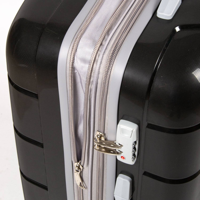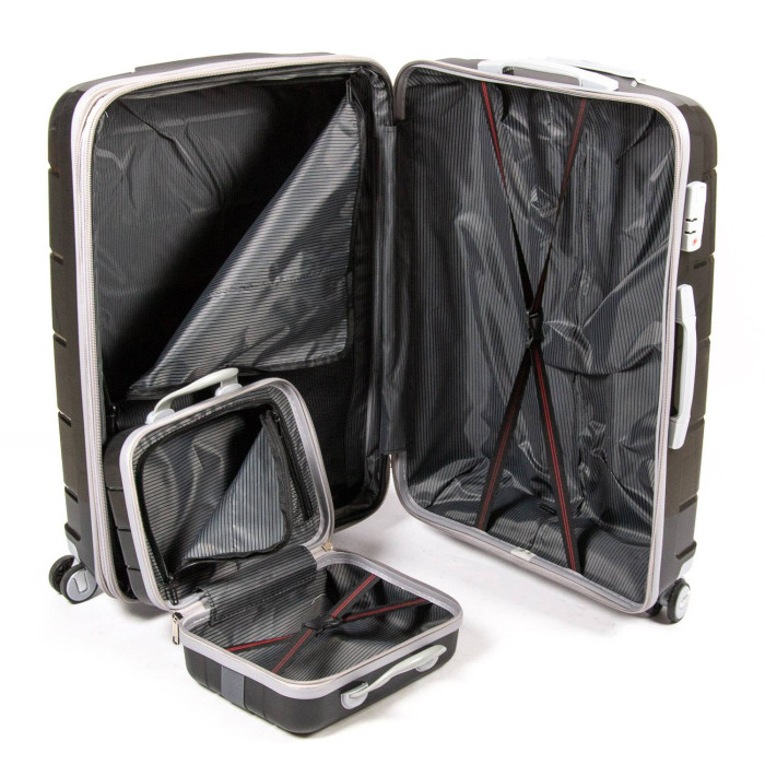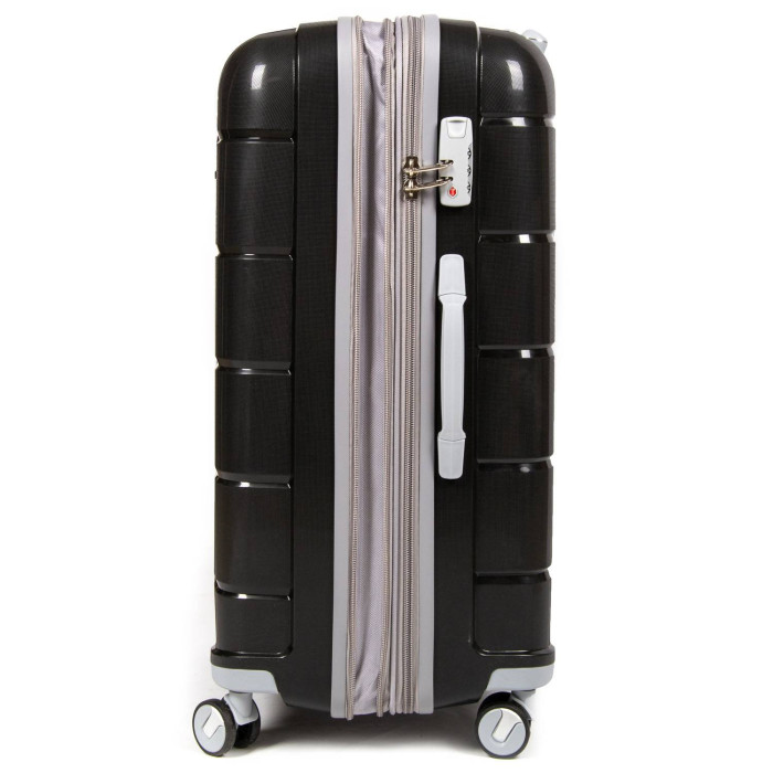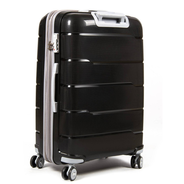 Пластиковый чемодан, выполненный из ударопрочного ABS пластика. Закрывается на молнию с кодовым замком. Объем чемодана можно увеличить используя молнию расширения (увеличивает глубину чемодана на 3см.). 4 полиуретановых двойных колеса с резиновой наружной частью. Внутри чемодана есть двойной отделение с карманом-перегородкой на молнии для мелких вещей и стяжки-резинки для фиксации багажа.