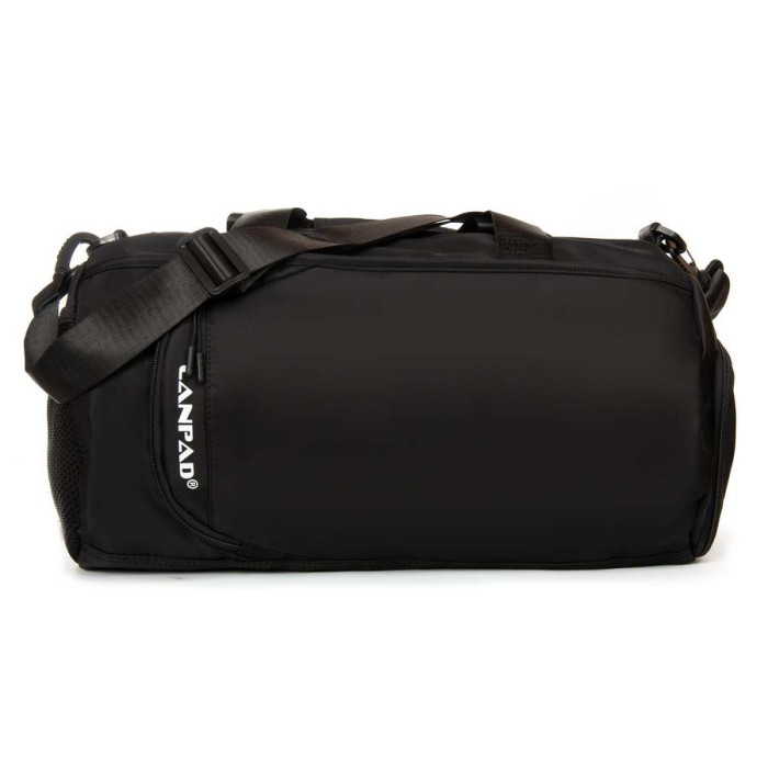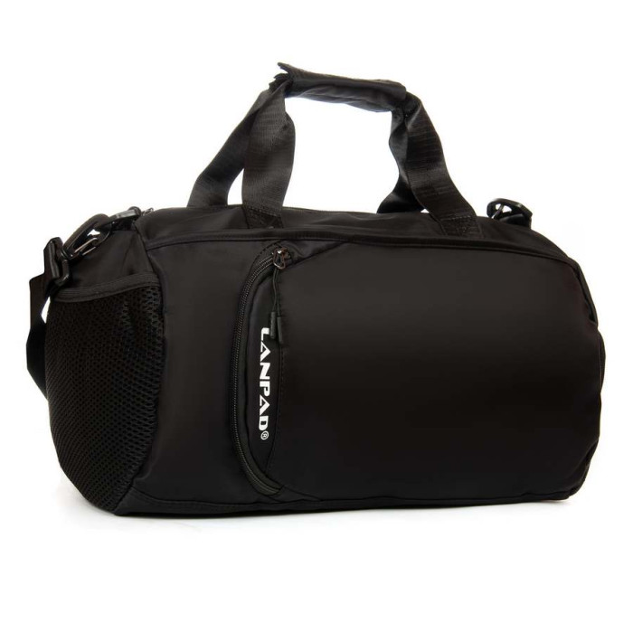 Дорожная/спортивная сумка Lanpad. Одно отделение, закрывается на молнию. Внутри отделения есть карман на молнии и двойной открытый карман. На фасаде находятся два карман на молнии, один из которых с герметичной подкладкой. На торцах сумки расположены карман для обуви и открытый карман-сетка.