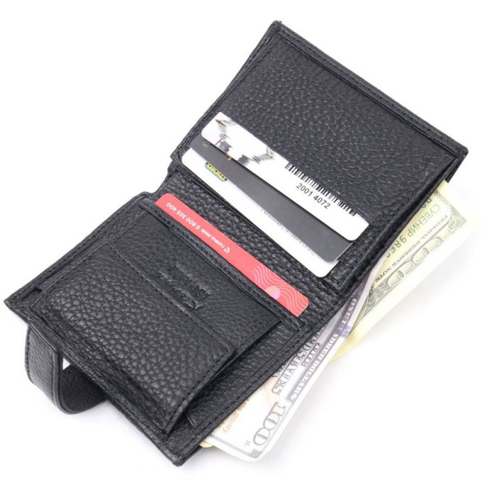 Удобный кошелек, из натуральной зернистой кожи. Модель вертикального типа, складывается пополам и закрывается хлястиком на кнопку. Лаконичный дизайн, отлично ложится в руку, помещается в карман, а также в любую сумку. Кожа премиум класса, приятная на ощупь. Отличная идея для подарка близкому человеку.