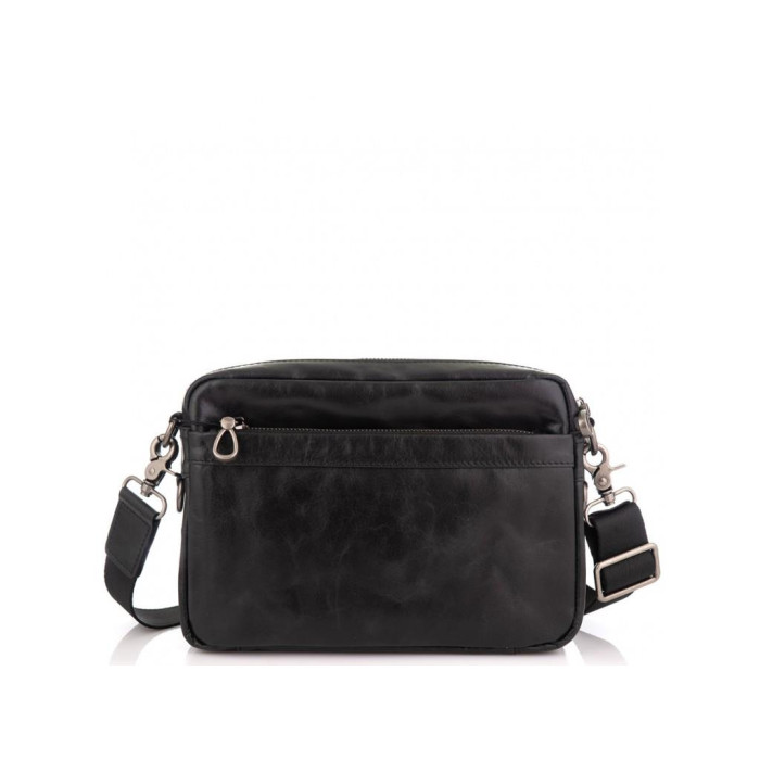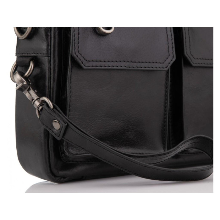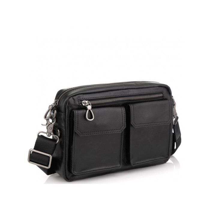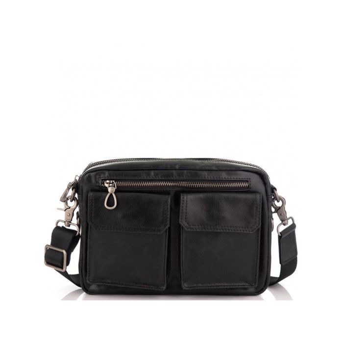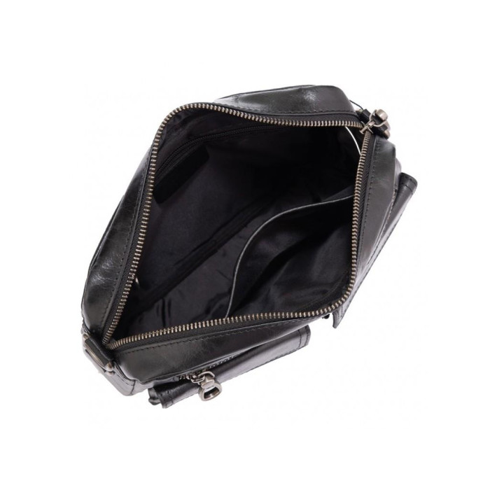 Компактная сумка кожаная в черном цвете. Ее можно носить как сумку через плечо, а также как барсетку. Для носки есть плотный текстильный ремень, который снимается, а также маленький ремень для носки на руке. Фурнитура в сумки надежная, темное серебро. Сумка имеет одно основное отделение. С лицевой стороны есть карман на молнии горизонтального типа, а также два накладных кармана на магнитной кнопке. Также карман на молнии с тыльной стороны. Внутри сумки карман на молнии и карман открытого типа.
