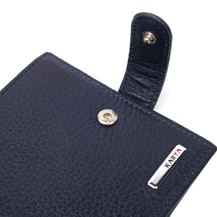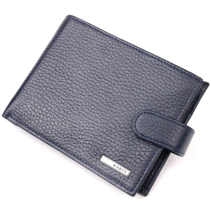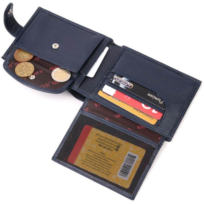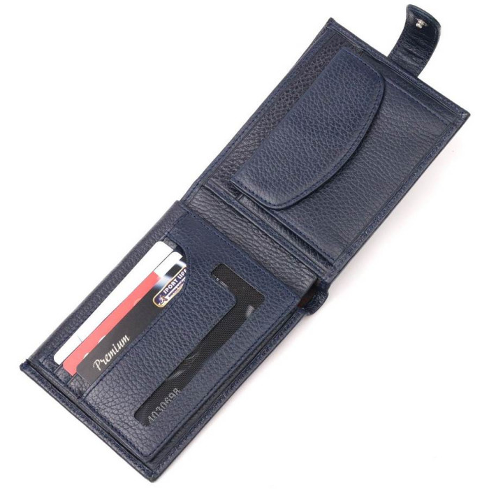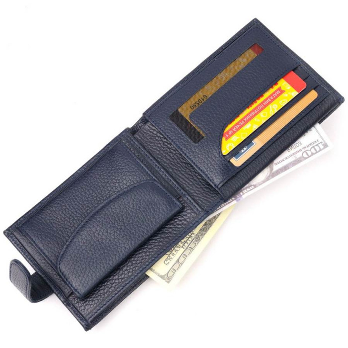 Красивый мужской кошелек из натуральной кожи, в синем цвете. Изделие закрывается хлястиком на кнопку. Изделие имеет вместительные отделения для купюр и внутри достаточно ячеек для кредиток. Изделие упаковано в фирменную коробочку. Изделия из натуральной кожи всегда будут отличным подарком для близкого человека.