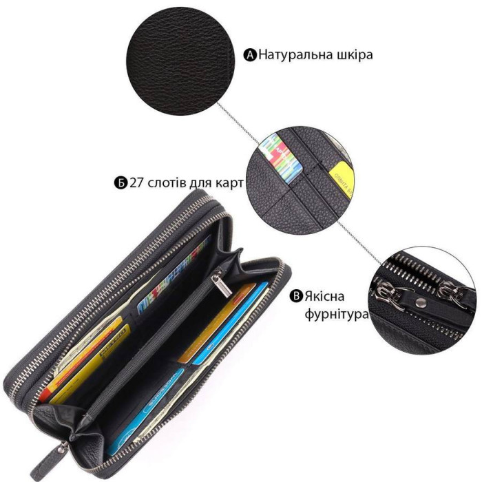 Модель состоит из двух самостоятельных отделений, каждое из которых закрывается на надёжную молнию. Внутри предусмотрены карманы для купюр, отделения на молнии для хранения ценных вещей, а также множество ячеек для пластиковых карт и документов. Такая структура позволяет удобно распределить содержимое и быстро находить всё необходимое.