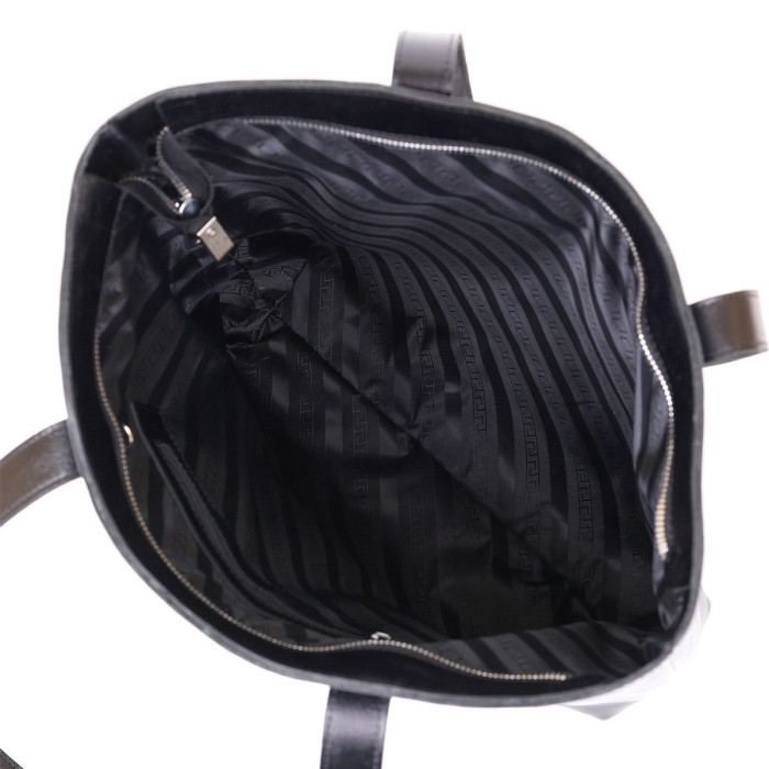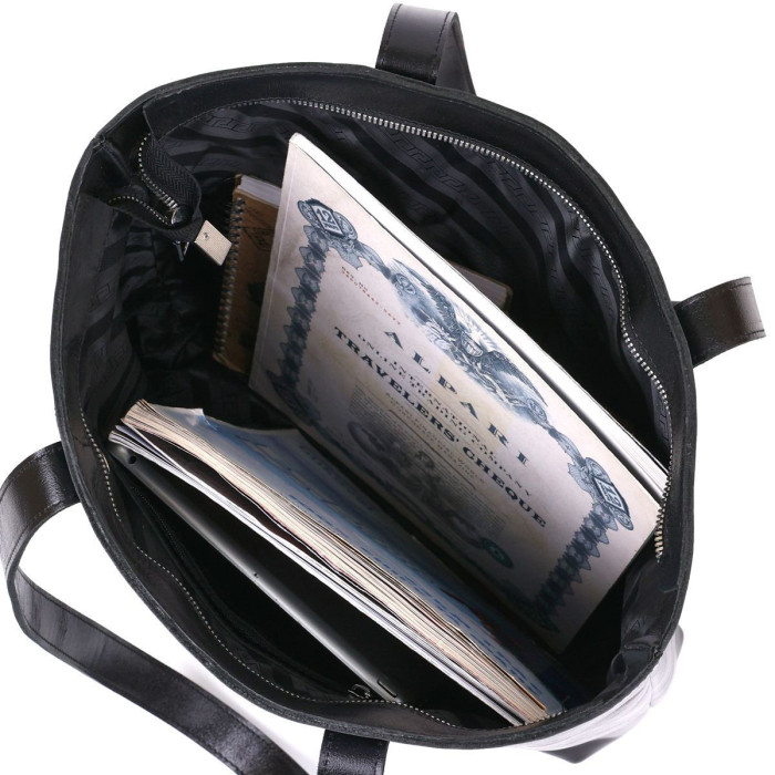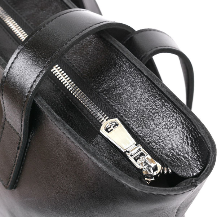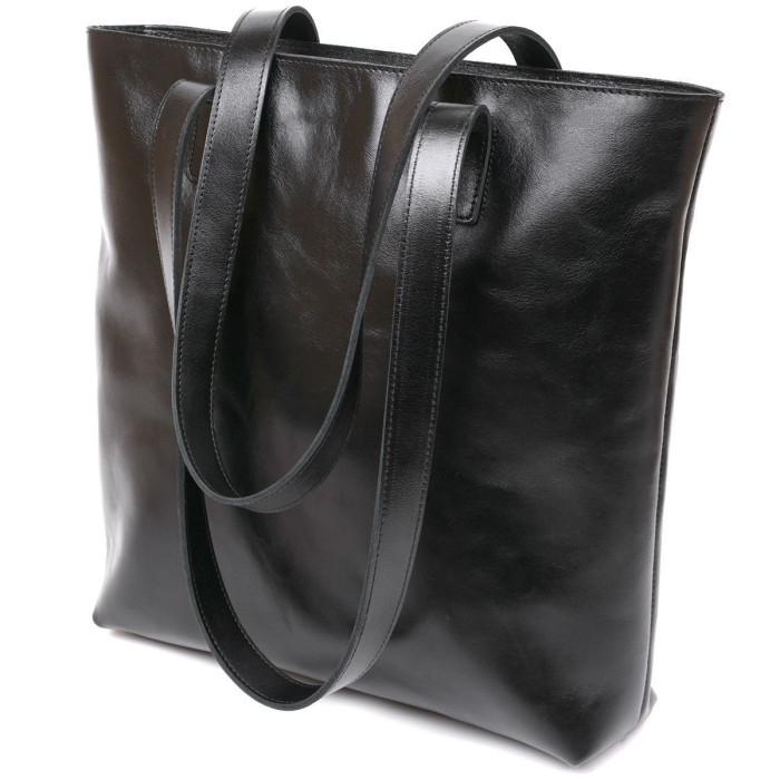 Вместительная сумка-шоппер стандартного размера в универсальном черном цвете, поэтому отлично впишется в гардероб любой модницы. Выполнена из натуральной высокопрочной кожи, качество которой видно даже на расстоянии. Имеет одно просторное отделение и потайной карман на молнии. Ручки сделаны также из плотной натуральной кожи. Фактура – гладкая и приятная на ощупь.