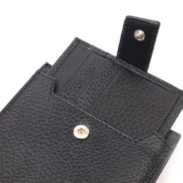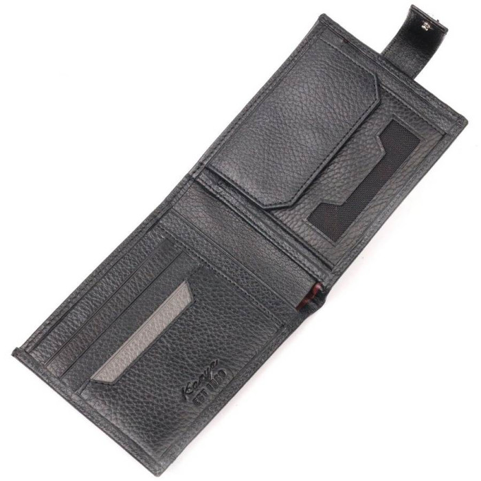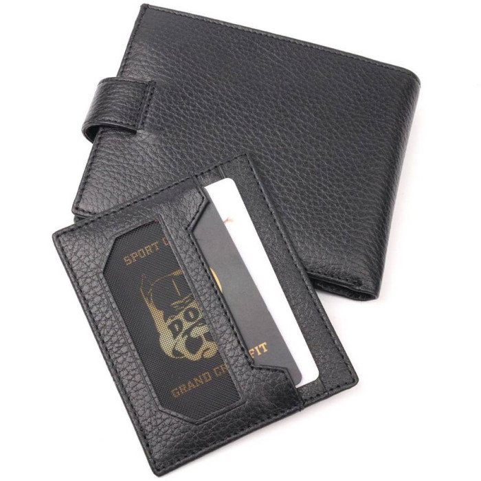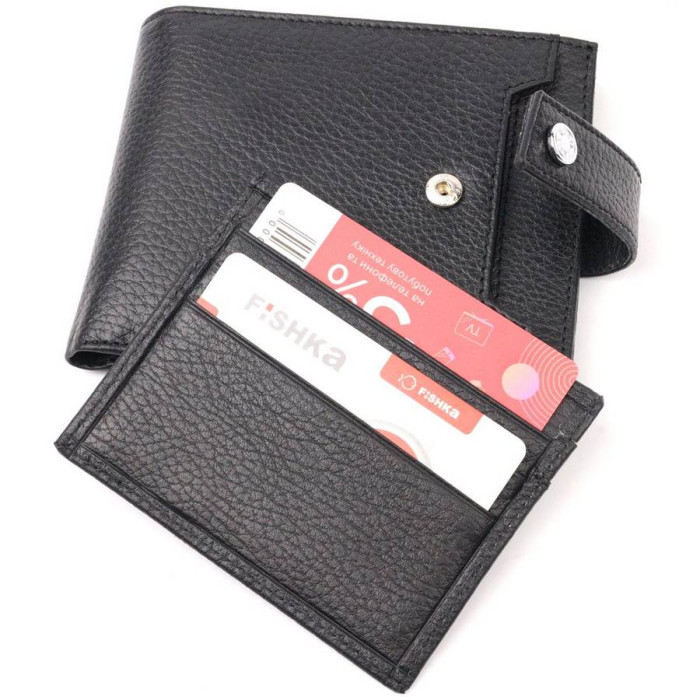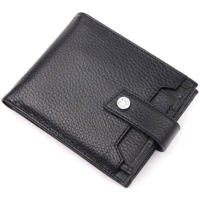 Отличный мужской кошелек из натуральной кожи, в классическом черном цвете. С наружной стороны находится карман с блоком под карточки и документы. Закрывается кошелек хлястиком с кнопкой. Обладает стандартным горизонтальным форматом, помещается в карман. Изделия из натуральной кожи всегда будут отличным подарком для близкого человека.