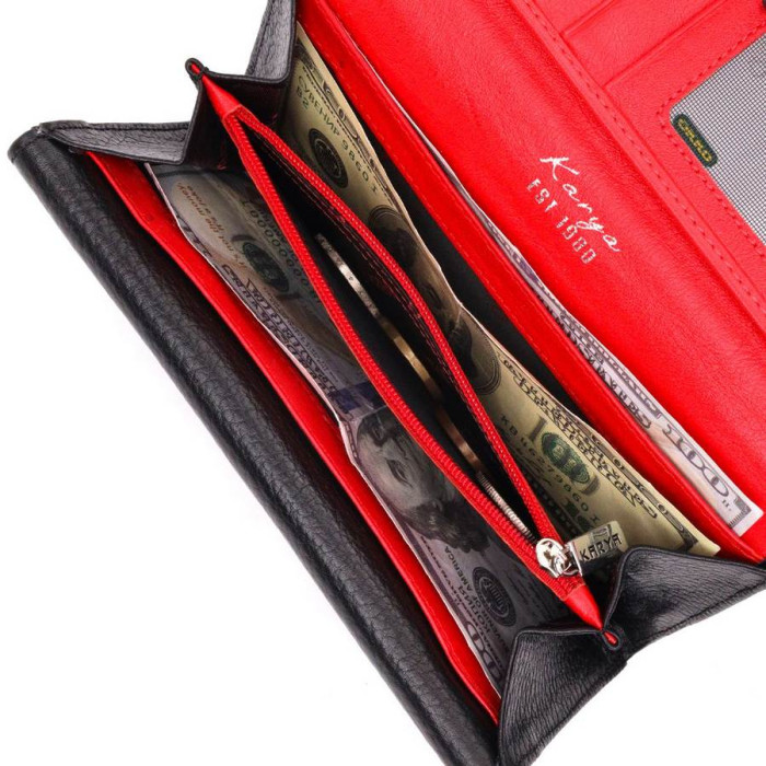 Прекрасный женский кошелек из натуральной зернистой кожи, в красивой комбинации цветов, снаружи – черный, внутри - красный. Изделие состоит из двух автономных отделений, которые закрываются клапанами на кнопку. Внутри представлено множество карманов, в которых можно удобно разложить купюры, пластиковые карточки и документы. Такой кошелек из натуральной кожи - это идеальный вариант на каждый день для тех, кто ценит качество, удобство и комфорт, а также будет отлично дополнять Ваш повседневный образ.