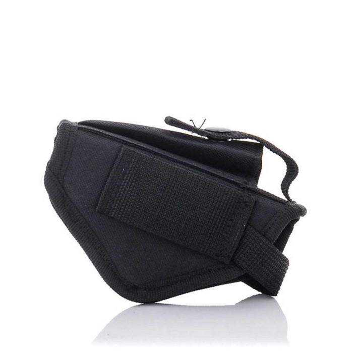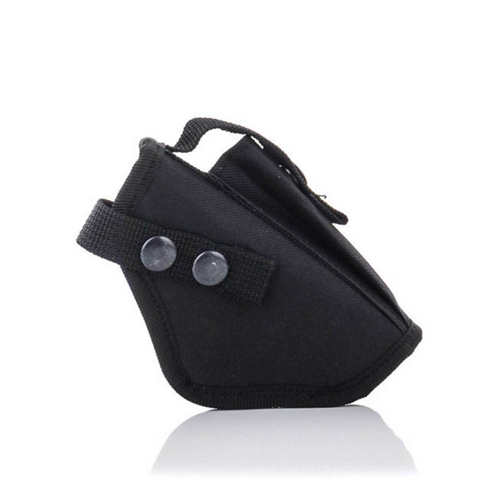 Кобура для пистолета универсальная 70524 выполнена из качественного плотного материала. Крепится на ремень шириной 5 см. С боковой части имеется отдел под запасной магазин, который фиксируется кнопкой. На ремешке, который фиксирует пистолет, имеет две кнопки, благодаря которым можно крепить пистолеты разного вида.