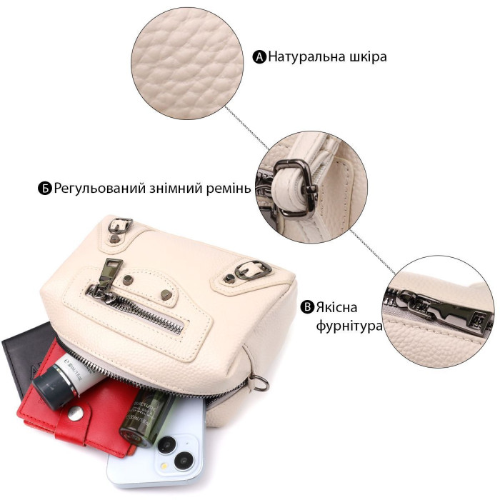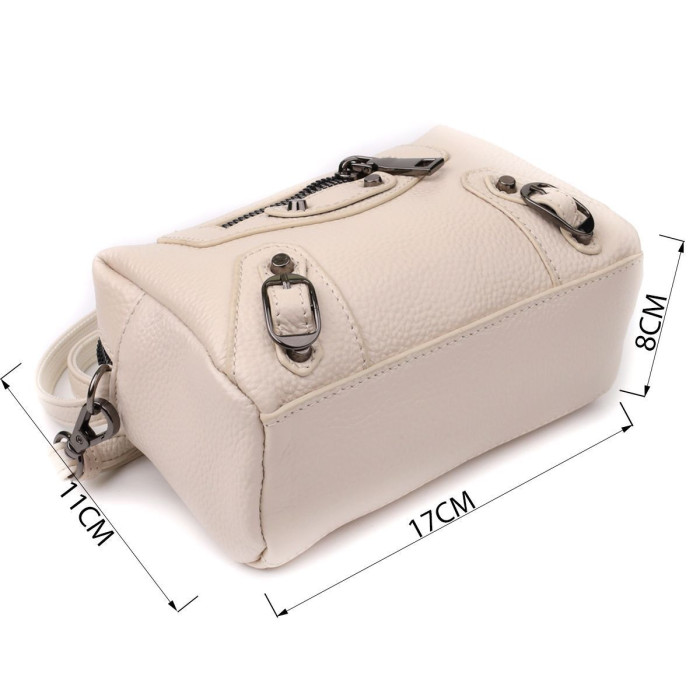 Идеальный выбор для тех, кто ценит смелые акценты и практичный формат — белая кожаная сумка с декоративной отделкой станет выразительной деталью в любом образе, от casual до городского шика.