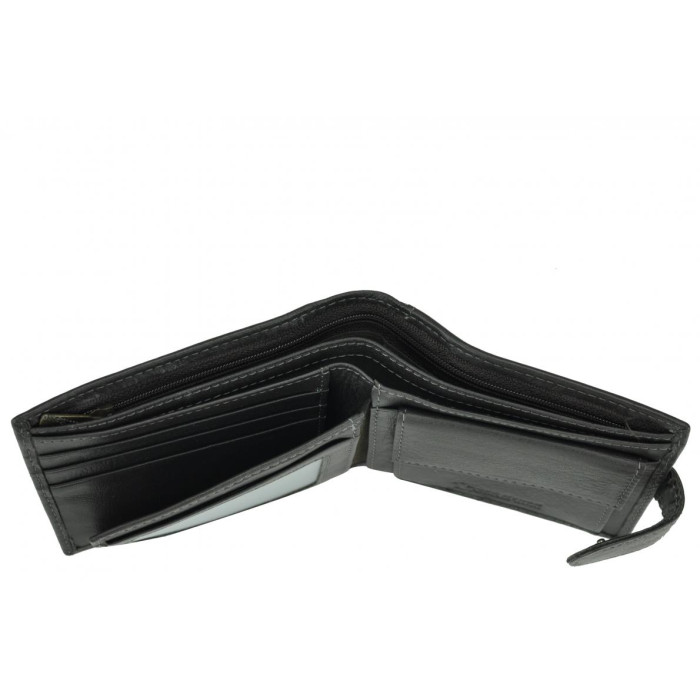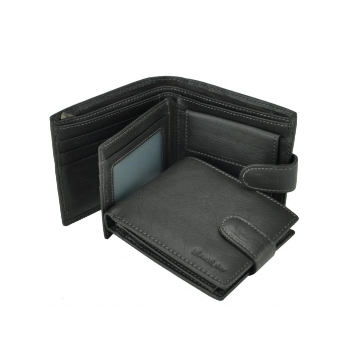 Мужское классическое кожаное портмоне двойного сложения. Подобная конструкция позволяет одновременно уменьшить габариты кошелька и сохранить его функциональность. Портмоне имеет прямоугольную горизонтальную форму. Кошелек прошит прочными нитками, все швы ровные и качественные. Для хранения купюр предусмотрено три отделения (одно из них на молнии), для мелочи – монетница, а для пластиковых карт, визиток и прав имеется отдел с множеством кармашков и прозрачный вкладыш. Закрывается аксессуар с помощью клапана со скрытым магнитом.