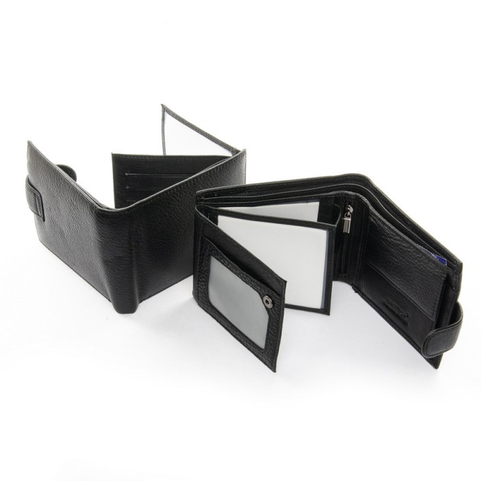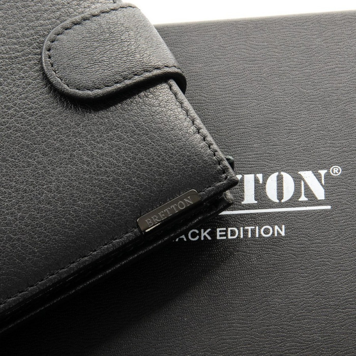 Мужской большой кожаный кошелек Bretton, серия Black Edition. Изготовлен из мягкой натуральной кожи. Внутри есть два открытых и одно на молнии отделения для банкнот, 3 кармана для визитных карт, 4 прозрачных кармана, карман на молнии и монетница на кнопке. Размер (см.) 12,5*10*3