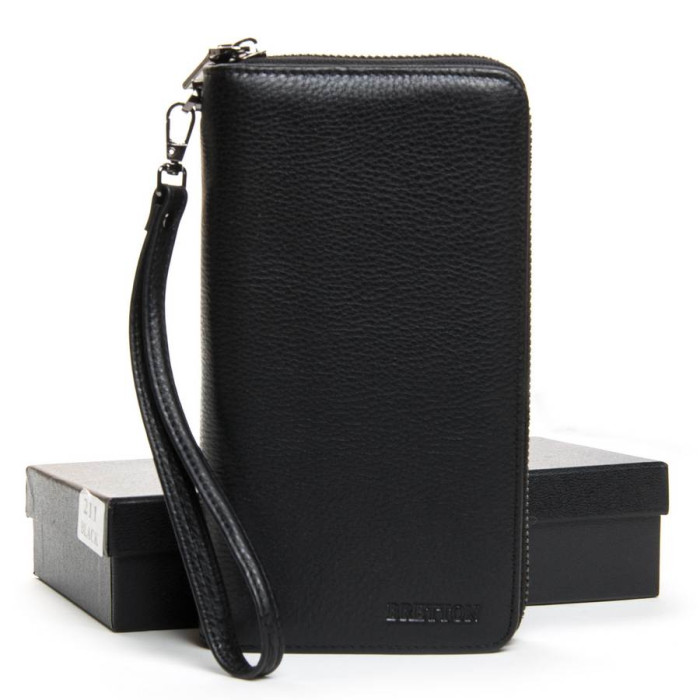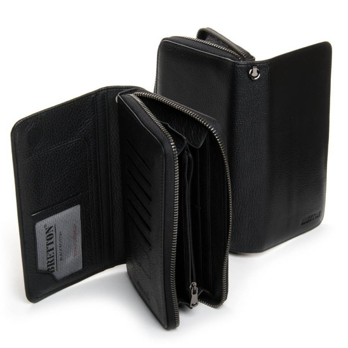 Мужской большой кожаный кошелек-клатч Bretton, серия Black Edition. Изготовлен из мягкой натуральной кожи. Одно основное отделение, закрывается на молнии. Внутри есть 2 отдельных кармана для банкнот или сматрфона, большой карман-монетница на молнии, 12 карманов для визитных карт и 2 больших открытых кармана. На фасаде есть дополнительное отделение, которое закрывается на скрытый магнит. Там расположены 7 карманов для визитных карт и три больших открытых кармана.