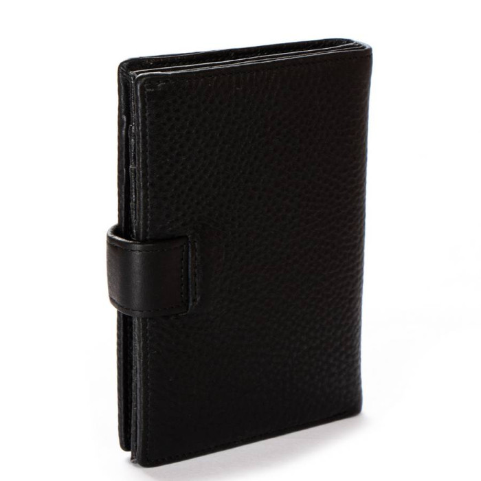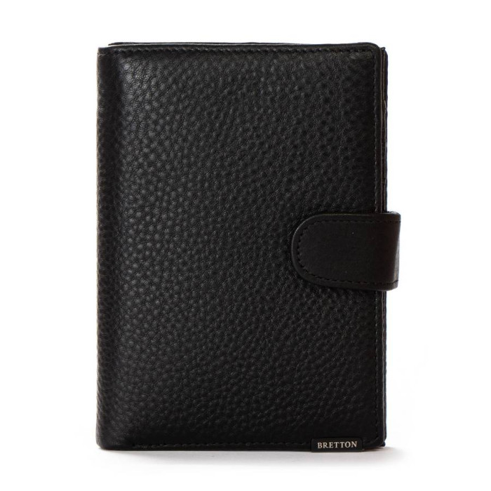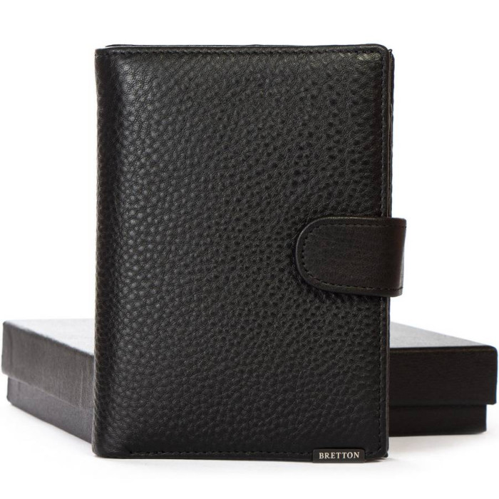 Мужской кожаный кошелек Bretton, серия Black Edition. Изготовлен из мягкой натуральной кожи. Внутри есть: два открытых и одно на молнии отделения для банкнот, 4 кармана для визитных карт, 3 больших кармана и монетница на кнопке. Также в дополнительном блоке есть отделение для паспорта.