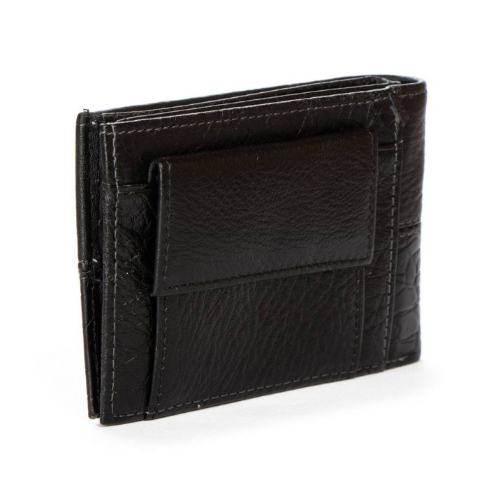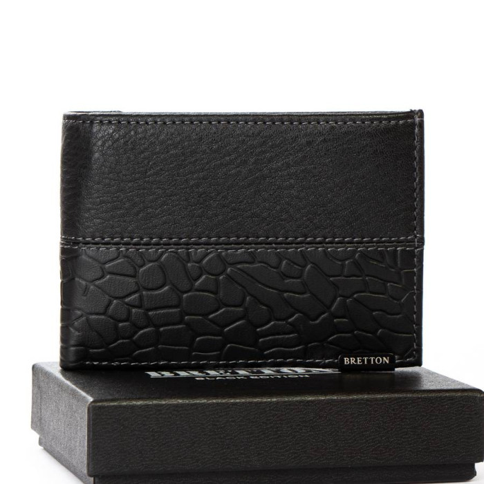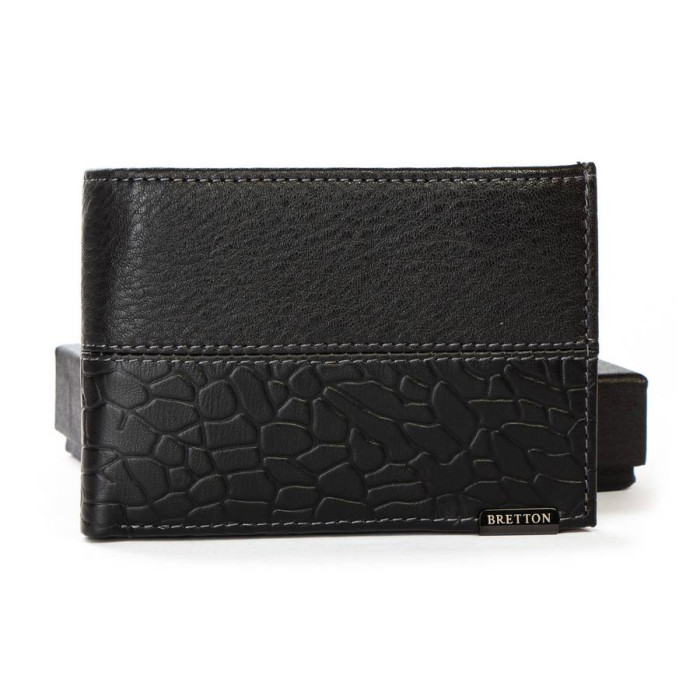 Мужской кожаный кошелек с зажимом для банкнот Bretton, серия Black Edition. Изготовлен из мягкой натуральной кожи. Внутри находится одно открытое и одно на молнии отделения для банкнот, 6 карманов для визитных карт. Снаружи на обратной стороне есть монетница на кнопке.