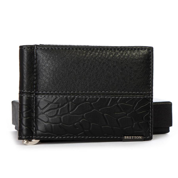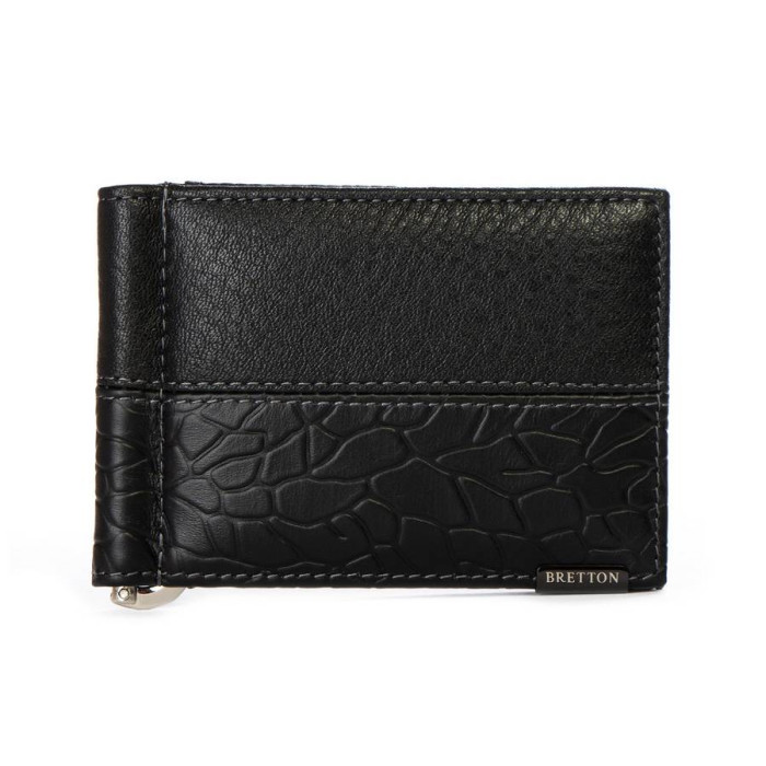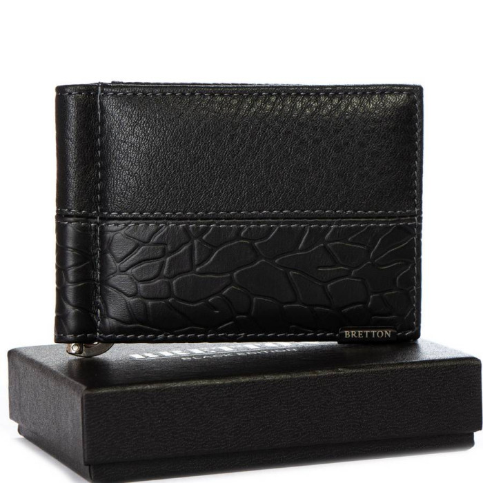 Мужской кожаный кошелек-зажим для банкнот Bretton, серия Black Edition. Изготовлен из мягкой натуральной кожи. Внутри есть один карман. Снаружи находится монетница на молнии.