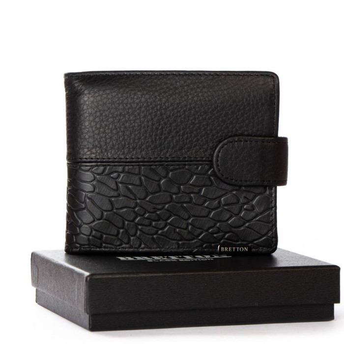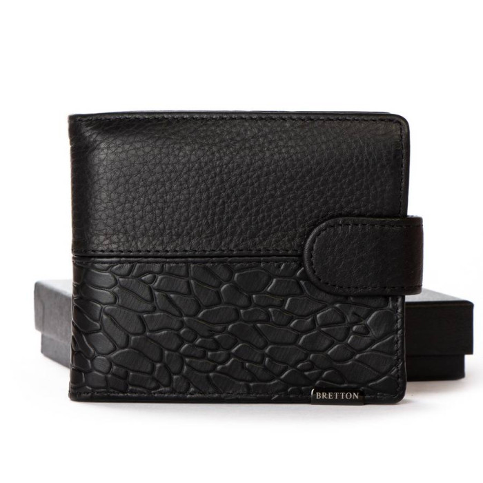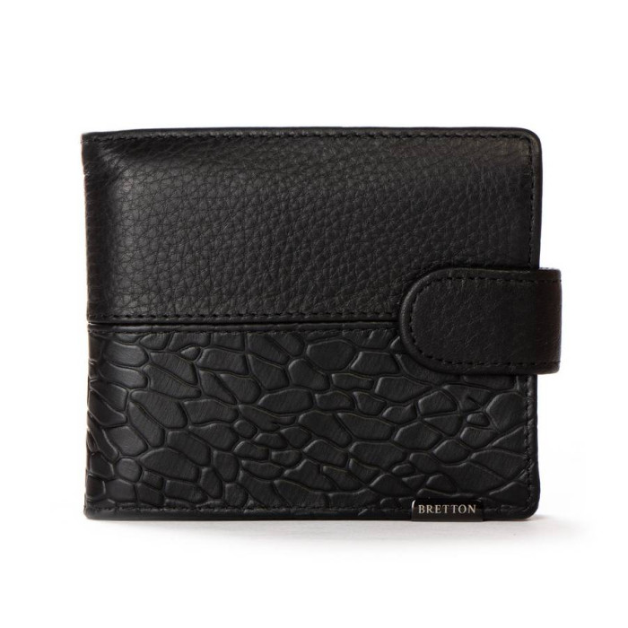 Мужской кожаный кошелек Bretton, серия Black Edition. Изготовлен из мягкой натуральной кожи. Внутри есть: два открытых и одно на молнии отделения для банкнот, 4 кармана для визитных карт и 2 больших кармана.