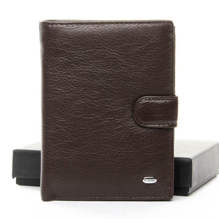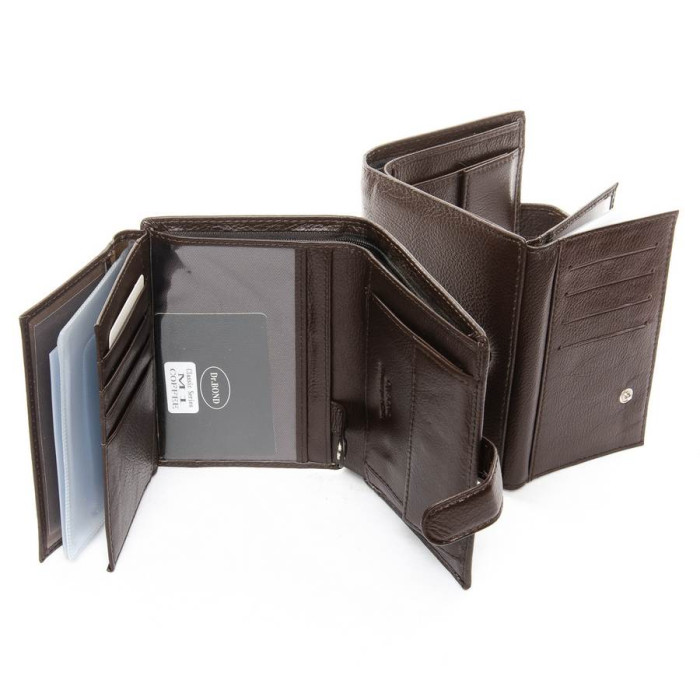 Вертикальное портмоне Dr.Bond с 2 отделениями под банкноты (1 змейка), внутри – откидной блок с правником, застегивающийся клапаном, отделение для мелочи, 5 больших карманов, 8 карманов под карты. Размер (см) 10,5*14*2.