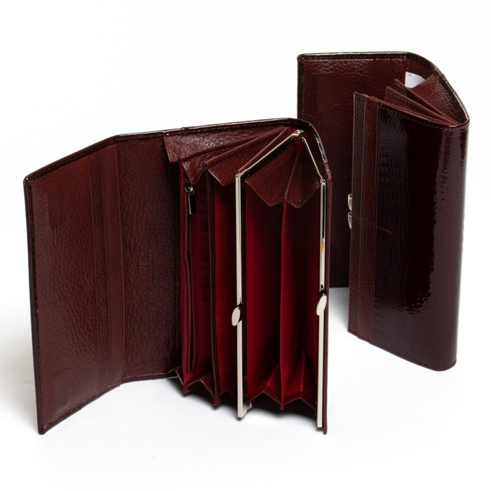 Большой женский кожаный кошелек Sergio Torretti. Наружная часть - лаковая кожа, внутренняя часть - натуральная мягкая кожа. Основное отделение закрывается на магнитную застежку. Внутри находятся 3 открытых отделения для банкнот, двойная монетница на защелке, карман-перегородка на молнии, один большой открытый карман и 9 карманов для визитных карт, один из которых прозрачный. Снаружи кошелька на обратной стороне есть плоский открытый карман.