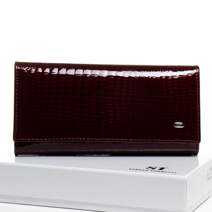Большой женский кожаный кошелек Sergio Torretti. Наружная часть - лаковая кожа, внутренняя часть - натуральная мягкая кожа. Основное отделение закрывается на кнопку. Внутри находятся 3 открытых отделения для банкнот, двойная монетница на защелке, карман-перегородка на молнии, один большой открытый карман и 9 карманов для визитных карт, один из которых прозрачный. Снаружи кошелька на обратной стороне есть плоский открытый карман.
