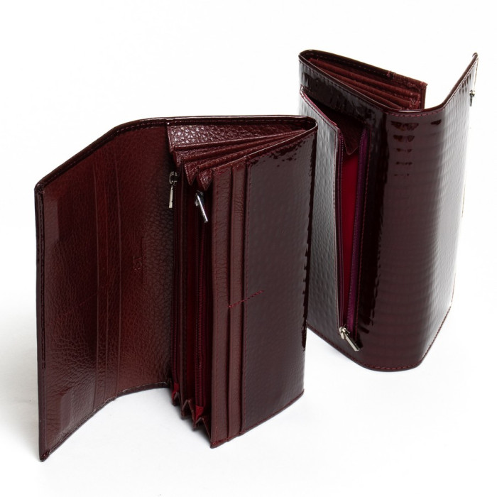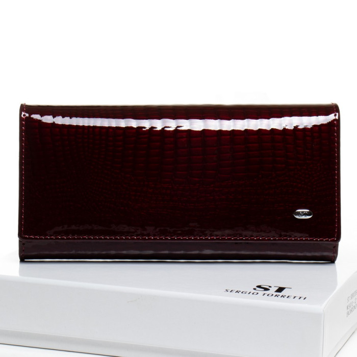 Большой облегченный женский кожаный кошелек Sergio Torretti. Наружная часть - лаковая кожа, внутренняя часть - натуральная мягкая кожа. Основное отделение закрывается на магнитную застежку. Внутри находятся 4 открытых отделения для банкнот, два кармана-монетницы на молнии, один большой открытый карман, 9 карманов для визитных карт, один из которых прозрачный. Снаружи кошелька на обратной стороне есть карман на молнии.