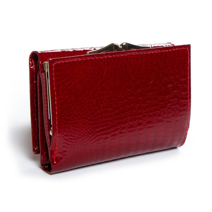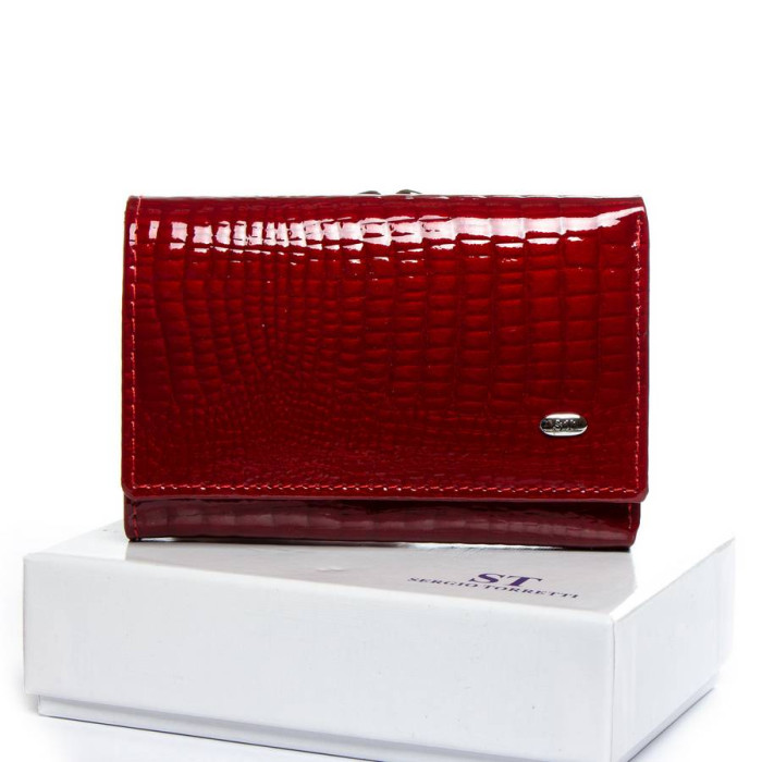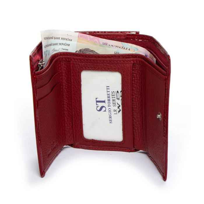 Компактный женский кожаный кошелек Sergio Torretti. Наружная часть - лаковая кожа, внутренняя часть - натуральная мягкая кожа. Основное отделение закрывается на кнопку и складывается втрое. Внутри находятся 2 открытых отделения для банкнот и одно на молнии, 5 карманов для визитных карт, один из которых прозрачный. Снаружи кошелька на обратной стороне есть монетница на защелке.