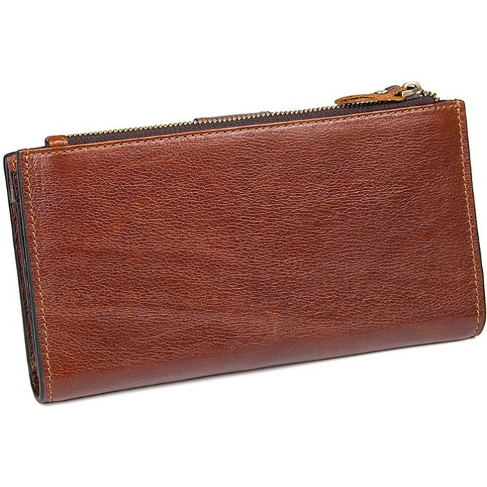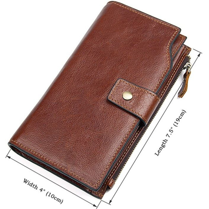 Отличная кожаная мужская барсетка-кошелек коричневого цвета. Аксессуар закрывается при помощи хлястика на кнопке. Цвет фурнитуры: желтый. На задней внешней стороне находится отделение для банкнот на молнии. Барсетка упакована в текстильный пылезащитный чехол белого цвета.