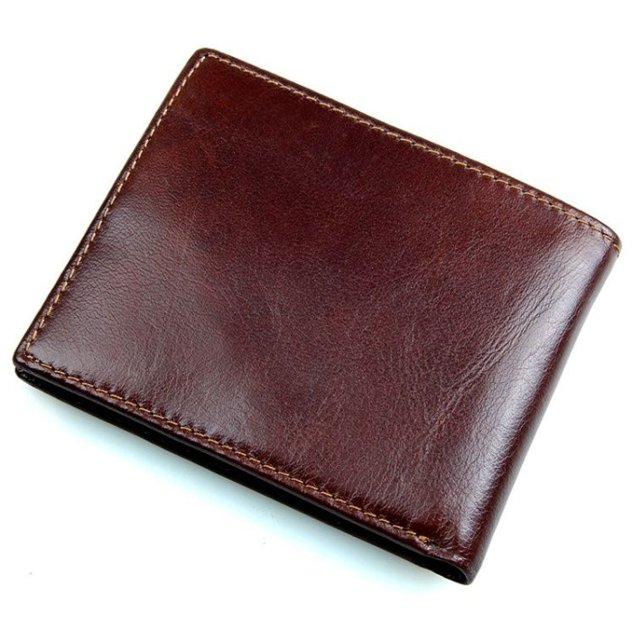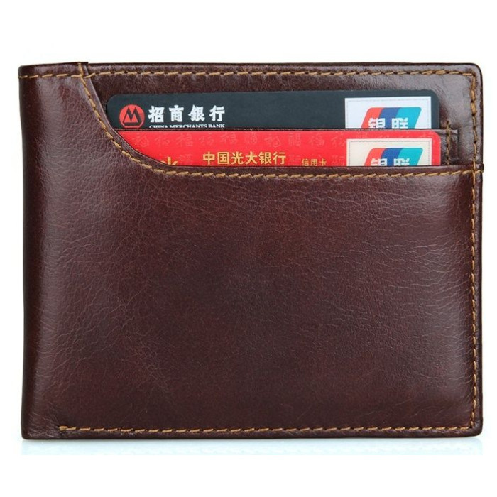 Тонкий мужской бумажник коричневого цвета. Аксессуар изготовлен из высококачественной натуральной кожи. Прошит кошелек прочной нитью светло-коричневого цвета. На лицевой стороне изделия находится накладной карман, в котором Вы найдете 3 отделения для пластиковых карточек. Отделение для монет в этом аксессуаре отсутствует. Кошелек упакован в текстильный пылезащитный чехол.