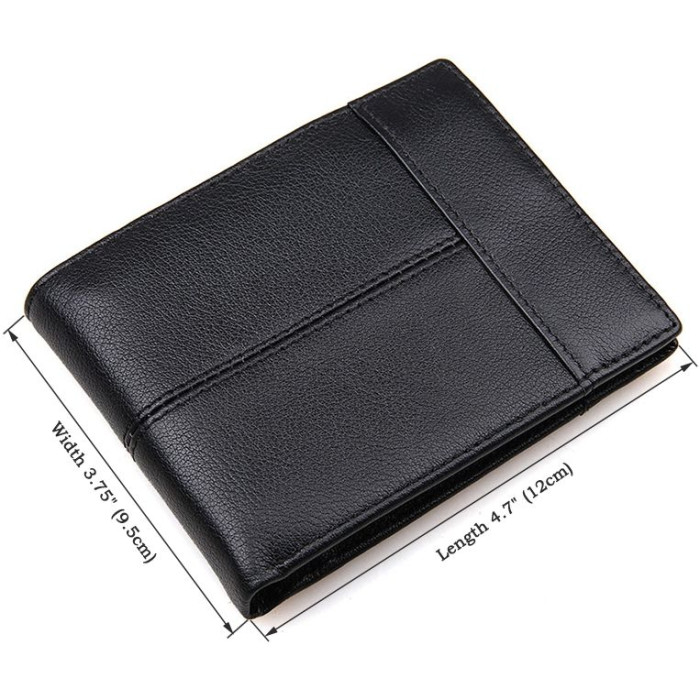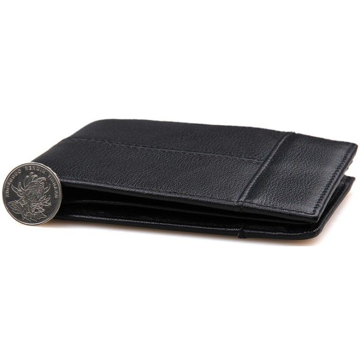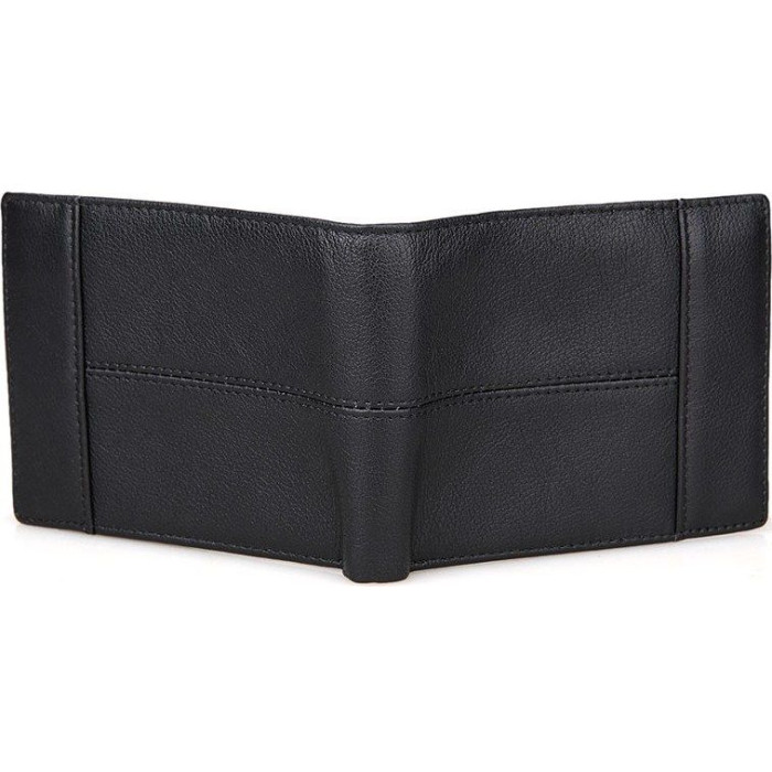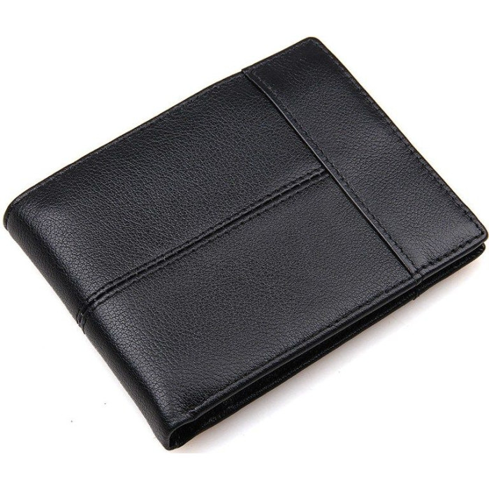 Современный мужской кожаный бумажник черного цвета. Аксессуар аккуратно прошит сверхпрочной нитью черного цвета, Внутри кошелек имеет два кармана для купюр. Которые помещаются в развернутом виде. Имеется отделения для карточек, монетница на заклепке и прозрачный карман для документов. Кошелек удобный при использовании, легко помещается в карман штанов, не занимает много места в сумке. Кошелек упакован в текстильный пылезащитный чехол.
