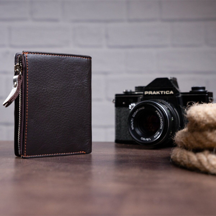 Аксессуар прошит по краям светло коричневой нитью. Модель небольшого размера и поместится в карман или сумку. Кошелек выполнен из натуральной кожи высокого качества. Фурнитура в кошельке цвета темного серебра. Модель оснащена самым необходимым функционалом для любого человека. Производство фабричный Китай высокого качества. Аксессуар упакован в пылезащитный чехол Если вы решите выбрать такой аксессуар на подарок для близкого человека точно не ошибетесь.
