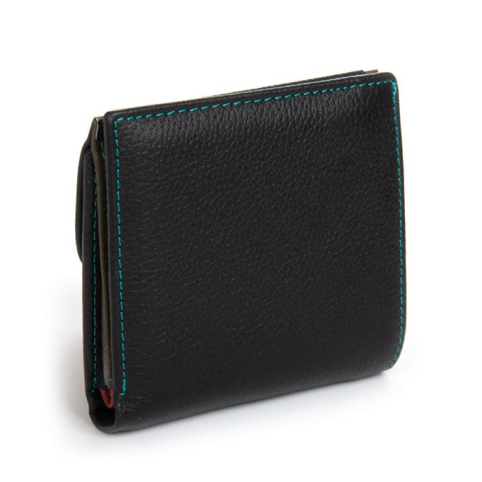Внутри находятся 2 открытых отделения для банкнот, разделенные кожаной перегородкой и одно отделение на молнии, 5 карманов для визитных карт. Снаружи кошелька на фасаде расположен карман-монетница под клапаном на кнопке.