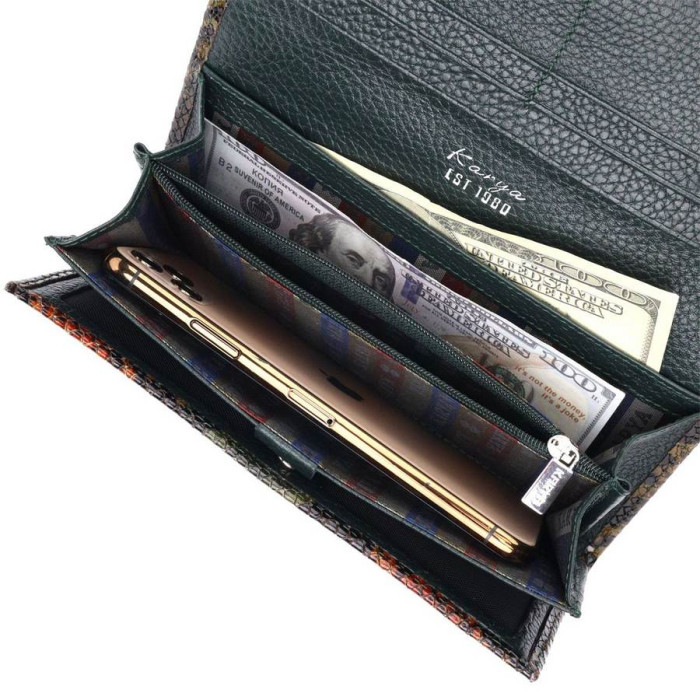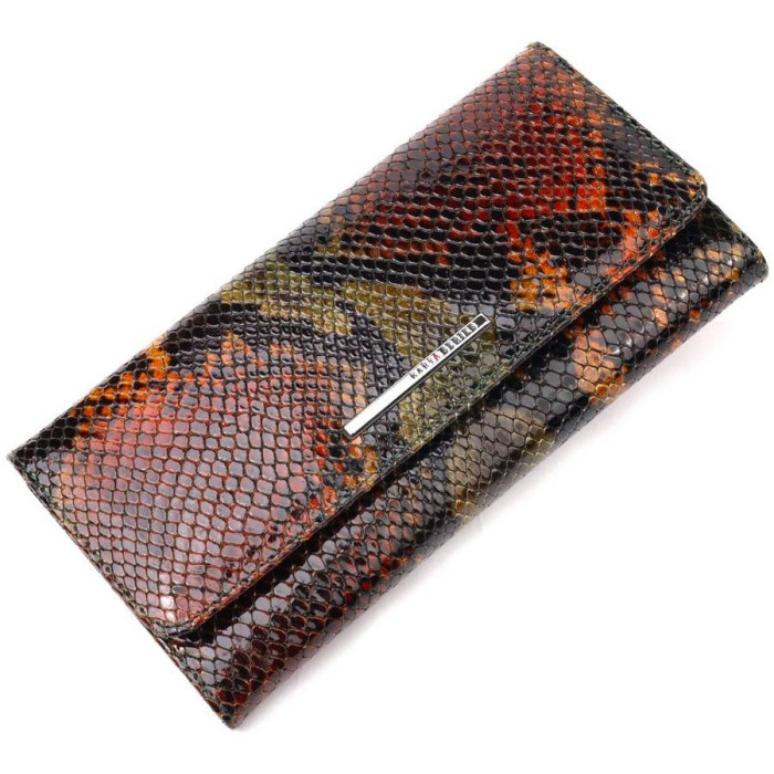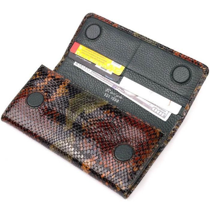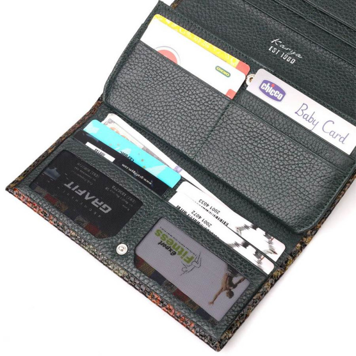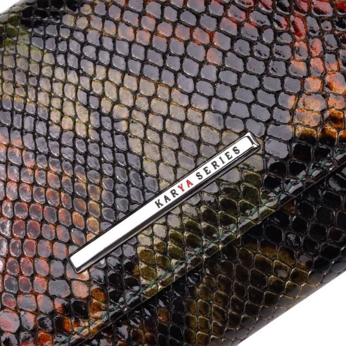 Функциональный женский кошелек из натуральной лакированной кожи, с тиснением под змею, в зеленом цвете. Складывается аксессуар пополам и закрывается клапаном на магниты. Особенностью данного аксессуара есть наличие блока для кредитных карточек, что закрывается на кнопку. Такой кошелек из натуральной кожи - это идеальный вариант на каждый день для тех, кто ценит качество, удобство и комфорт, а также будет отлично дополнять Ваш повседневный образ.