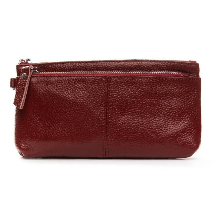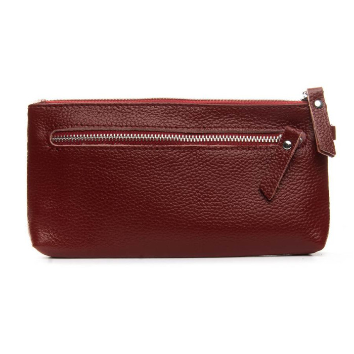 Женский кожаный кошелек-косметичка. Одно основное отделение с карманом, закрывается на молнию. На фасаде и обратной стороне есть большие карманы на молнии. В комплекте сьемный кистевой ремешок. Размер (см.) 20*10*3