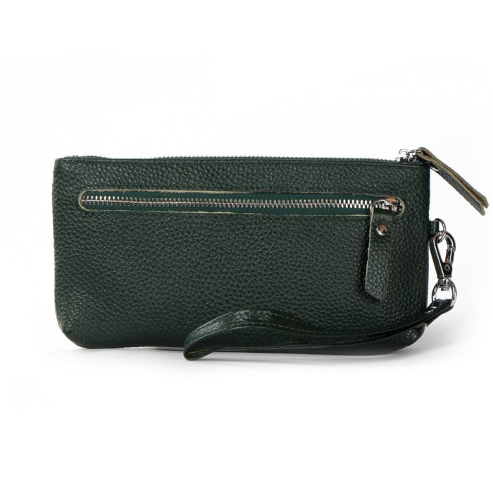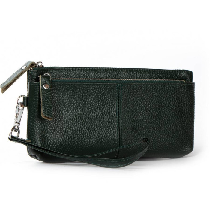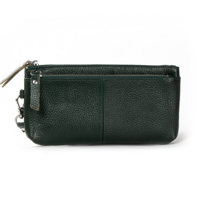 Женский кожаный кошелек-косметичка. Закрывается на молнию. Одно основное отделение с боковым открытым карманом. На фасаде и обратной стороне есть большие карманы на молнии.