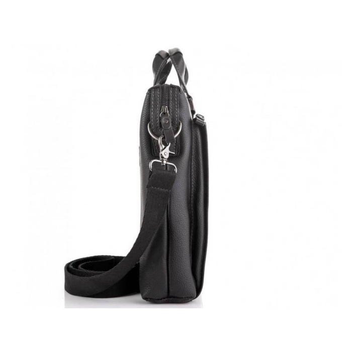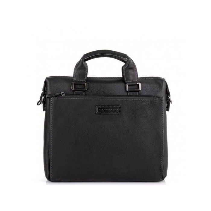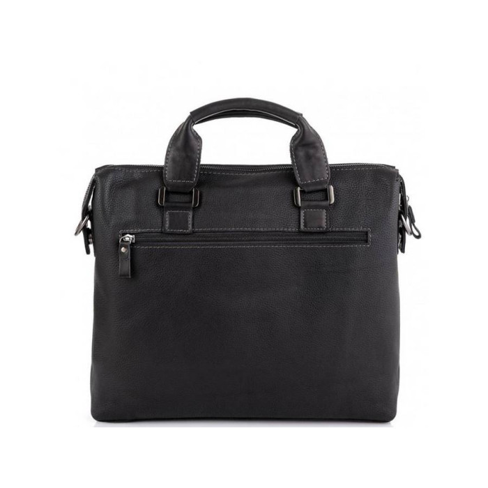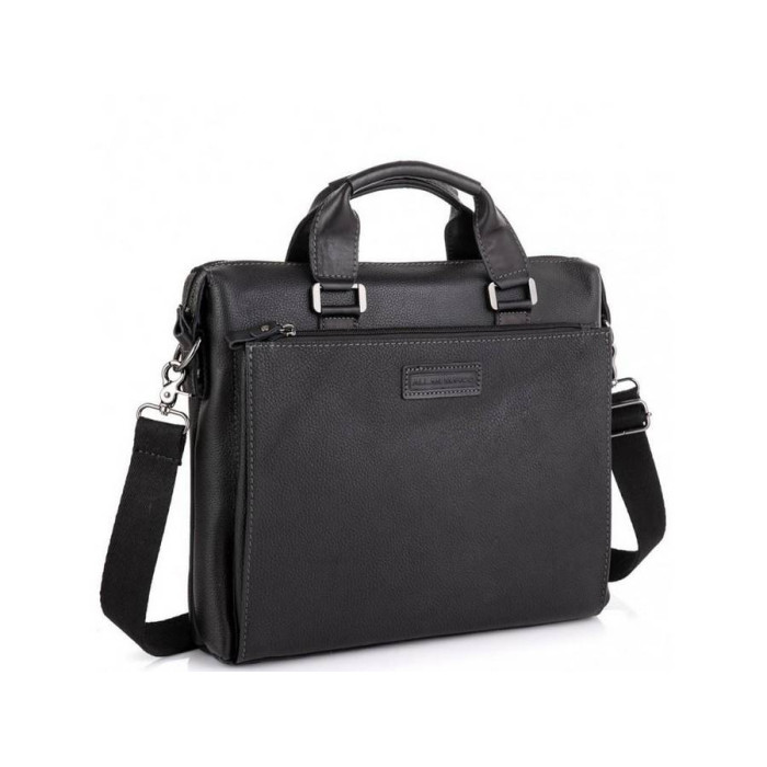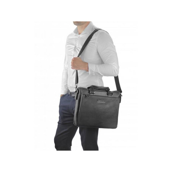 Сумка для ноутбука черная с зернистой текстурой. Имеет серебристую фурнитуру, плечевой ремень который регулируется по длине и имеет резиновую накладку, а также кожаные ручки для носки сумки в руке. Мужская сумка для ноутбука состоит из основного отделения на молнии. С лицевой стороны есть накладной карман на молнии, с тыльной стороны также карман на молнии. Внутри сумки есть два отделения между которыми есть карман для гаджета на кнопке, а также карман на молнии и карман открытого типа.