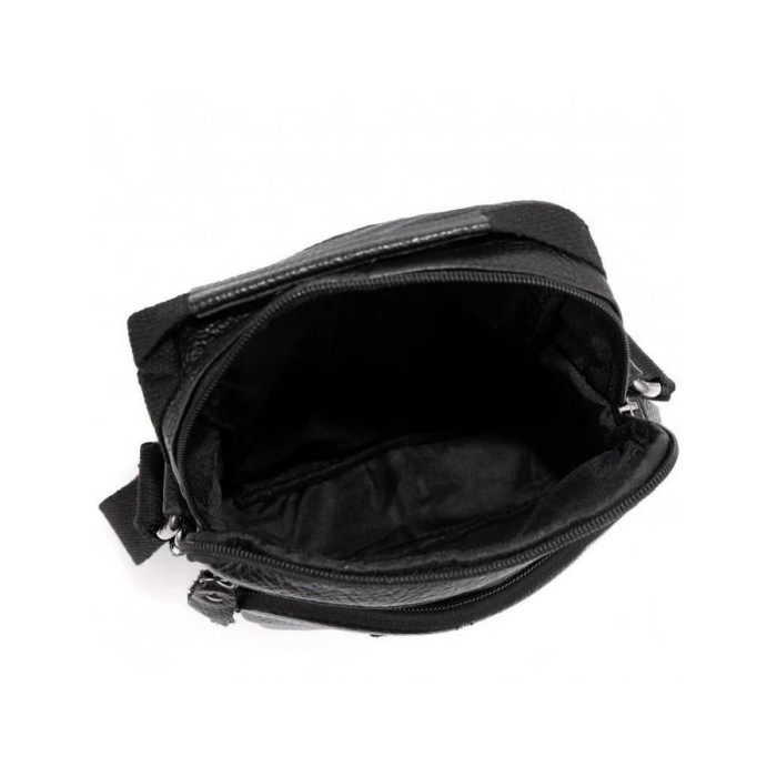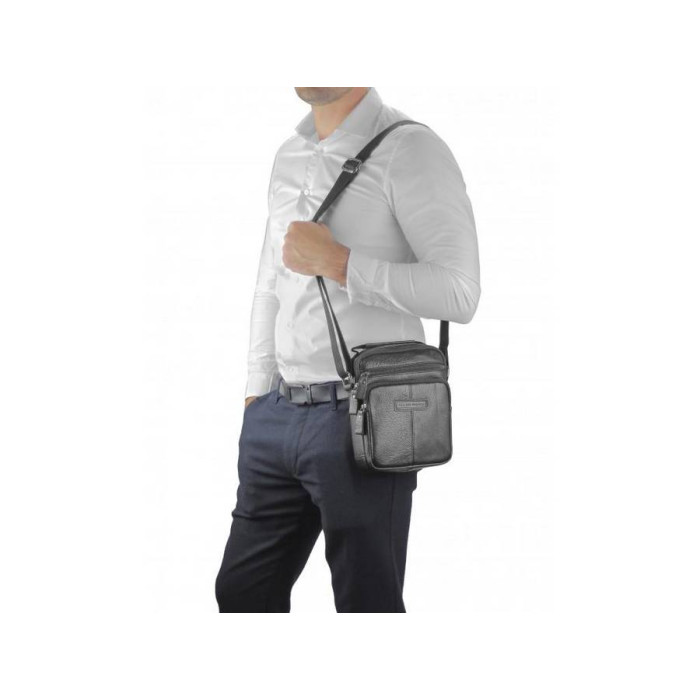 Имеет надежную фурнитуру, кожаные пуллера и текстильный плотный наплечный ремень, который регулируется по длине. У сумки одно основное отделение, с лицевой стороны два кармана на молнии и один карман с тыльной стороны. Внутри основного отделения карман на молнии.