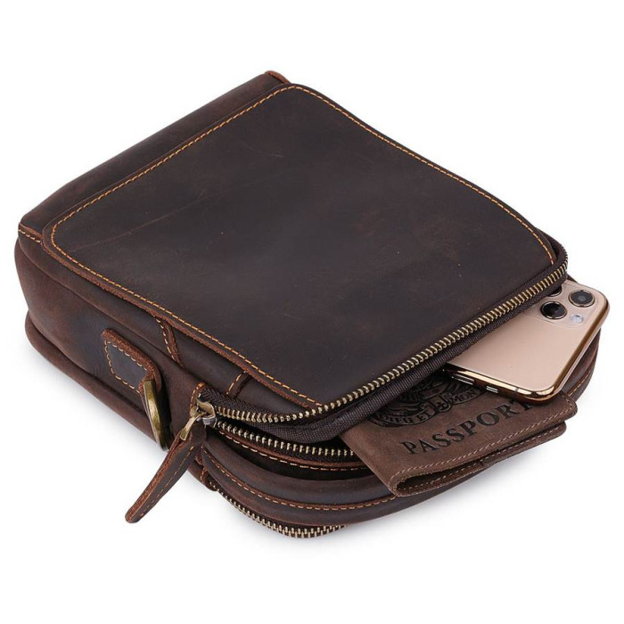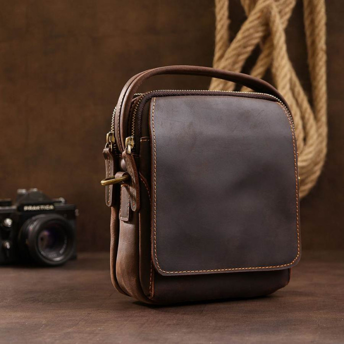 Компактная мужская сумка в шикарном коричневом цвете с винтажной фактурой. Материал изготовления – натуральная кожа с повышенной прочностью и износоустойчивостью. Имеет два основных отделения на молнии и внешние карманы. Спереди оригинально смотрится накидной клапан с магнитом, под которым спрятался карман. Данная модель очень популярна и востребована среди наших клиентов.
