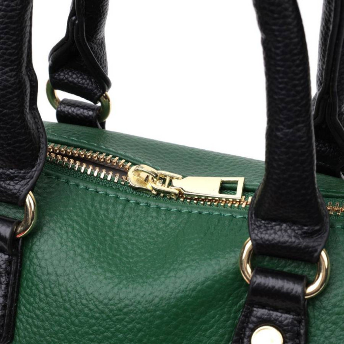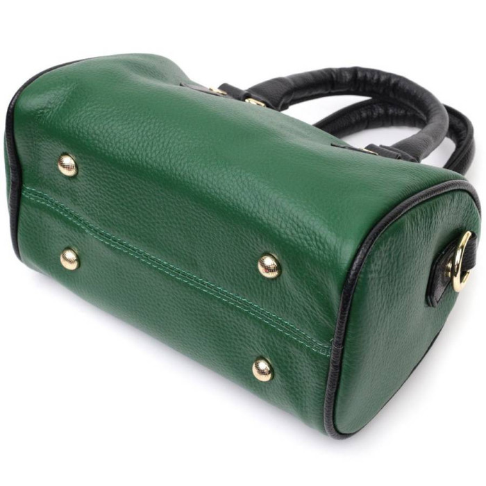 Интересная женская сумка-боченок из натуральной кожи. Изделие представлено в сочетании двух цветов зеленого и черного.Аксессуар состоит из одного отделения в котором потайной карман на молнии. Носить сумку можно в руке, для этого предусмотрены кожаные ручки, а также на плече и через плечо, для этого имеется кожаный съемный ремень. В аксессуаре использована качественная фурнитура цвета желтого золота. Отличный вариант сумки для женщин, которые любят качественные и стильные вещи.