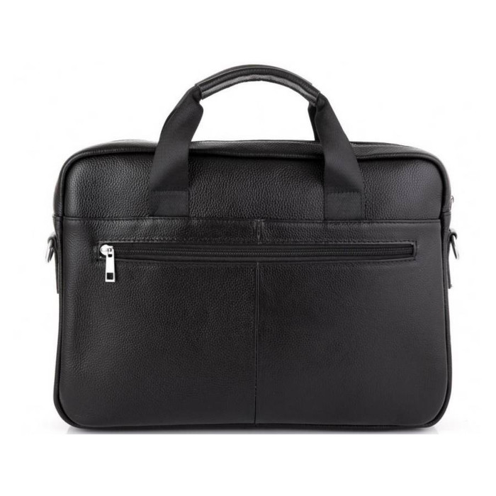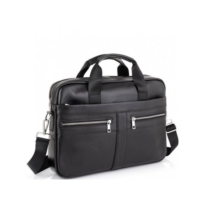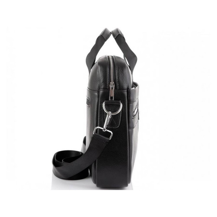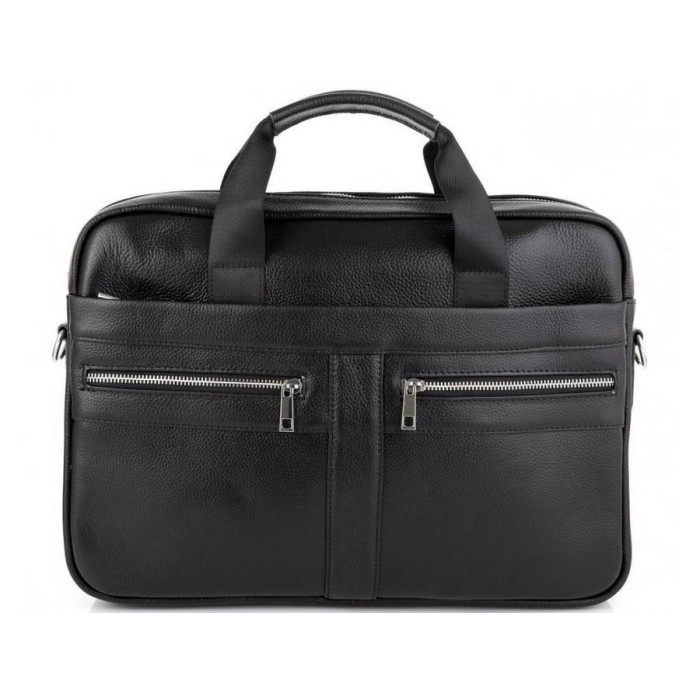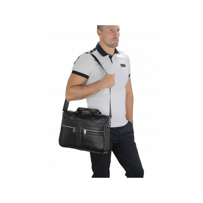 Стильная сумка для ноутбука в черном цвете. Сделана из натуральной кожи с зернистой текстурой. Имеет серебристую фурнитуру и текстильный плечевой ремень. Для переноски также можно использовать ручки с кожаными вставками. Подойдет для ноутбуков на 14 дюймов. Одно основное отделение. С лицевой стороны один большой карман на молнии, и два маленьких кармана на молнии. С тыльной стороны карман на молнии горизонтального типа. Внутри сумки отделение для ноутбука на липучке, карман на молнии и два кармана открытого типа.