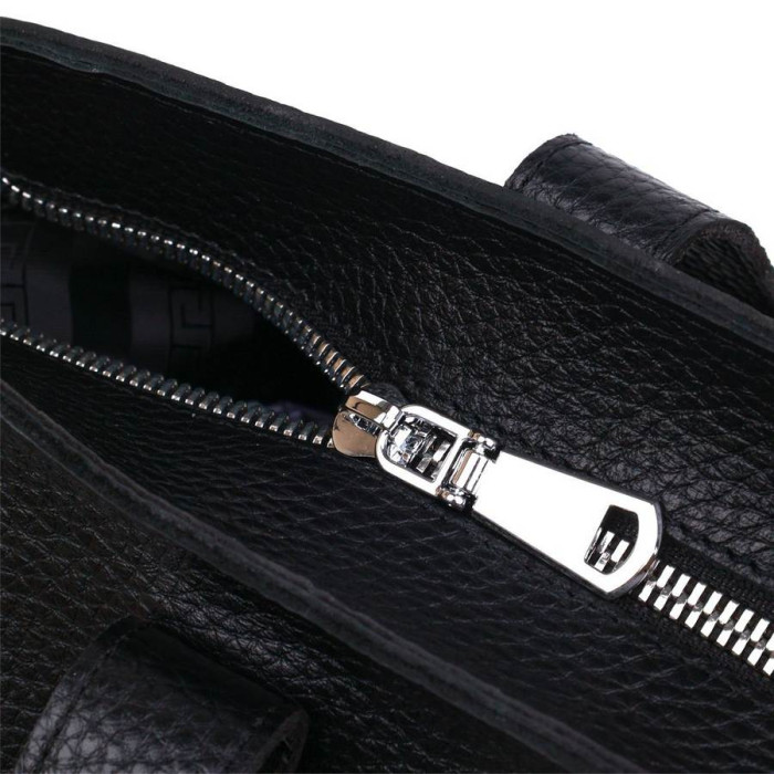 Универсальная женская сумка-шоппер от украинского производителя в практичном черном цвете, поэтому легко подойдет под любой цвет и стиль одежды. Выполнена модель из натуральной кожи высокого качества и отменными характеристиками. Фактура – зернистая и очень приятная на ощупь. Внутри есть одно вместительное отделение на молнии и потайной карман.