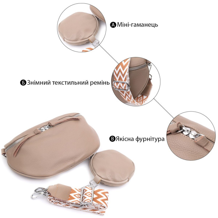 Стильная сумка через плечо из натуральной кожи флотар, которая неприхотлива в уходе и долго носится. Аксессуар состоит из основного отделения, кармана на молнии внутри, а также съемного мини кошелька. Носить сумку можно на плече и через плечо, для этого имеется текстильный съемный ремень. В аксессуаре использована качественная фурнитура цвета серебра.